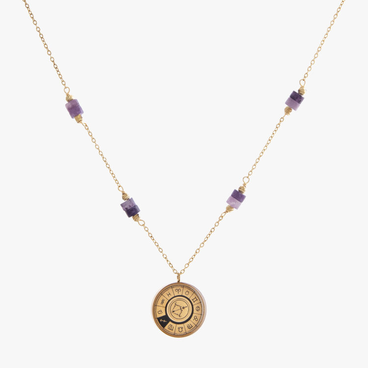 گردنبندهای این مجموعه با ترکیبی از مهرههای بنفش و طلای درخشان ساخته شدهاند. پلاک گردنبندها اغلب با نماد قوس یا صورت فلکی آذر طراحی شده و برخی مدلها دارای آمتیست تراشخورده هستند. ورق طلای ۲۴ عیار در ساختار آنها، جلوهای لوکس به گردن شما میبخشد. قیمت هر گردنبند زیر تصویر محصول در سایت درج شده و متناسب با وزن و طراحی آن متفاوت است.