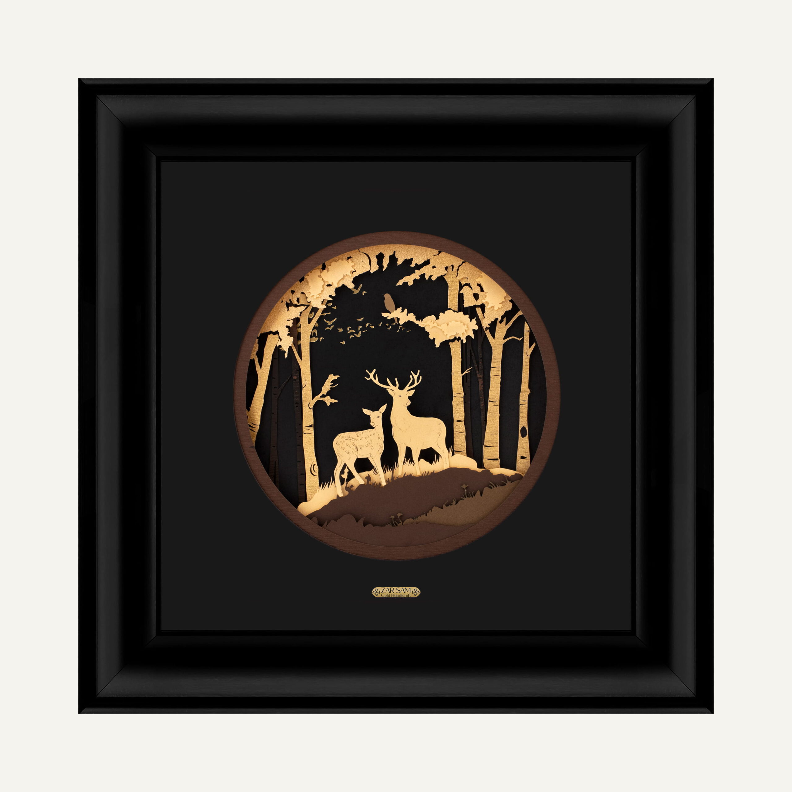 گوزن این حیوان زیبا و اساطیری، یکی از حیواناتی است که دارای نماد خاص در فرهنگهای گوناگون است. گوزن مظهر تیزپایی و طول عمر و وقار است و در باورهای اساطیری نماد نیروی بدنی و قدرت در دویدن است. در ایران باستان نقش گوزن روی مهرها نقش شده است؛ که البته در دوران اشکانی و ساسانی این اشکال بسیار زیاد بود. در این دوران اشکال گوزن بر مهرها و پارچههای دوره ساسانی به کار میرفت. این نقش تجسم صحنههای دلاوری و نشان شاهی است که بر ساغرهای نقرهای در دوره اشکانی به شکل گوزن ظاهر میشد. گذشتگان معتقد بودند که وقتی با گوزن روبرو میشوی، شیفته شکوه و ظرافت حرکاتش شده و این حیوان میتواند انسان را برای لحظهای میخکوب کند. پس گوزن سمبل عشق، زیبایی، شکوه، سرعت، تواضع، معنویت، خلاقیت و نگهبانی بوده است. طراح با ظرافت هر چه تمام اجزای این تابلو را در کنار هم چیدمان کرده است و با بالا و پایین قرار دادن قطعههای موجود به گونهای فضای تابلو را سه بعدی کرده که از زیباییهای این محصول میباشد. گوزنهای ظریف ورق طلا از نقاط عطف این تابلو است.