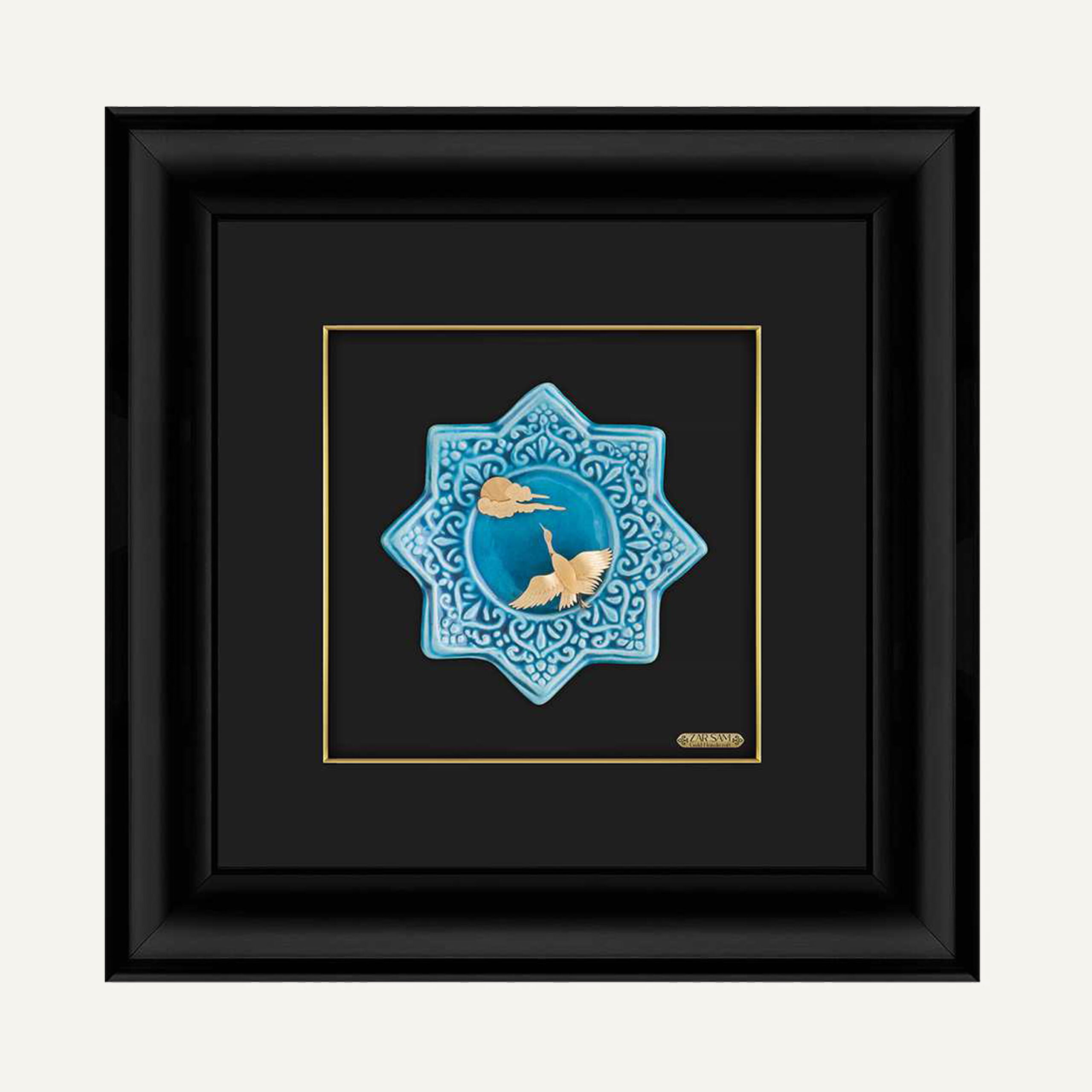 طراح در این اثر با قرار دادن پرنده از جنس ورق طلا در مرکز و تکه ابر کوچک در قسمت سمت چپ کار بر روی پس زمینهی ستارهی هشتپر فیروزهای که تداعی کنندهی آسمان است در عین سادگی یک تابلوی خاص و ظریف طراحی کرده است.