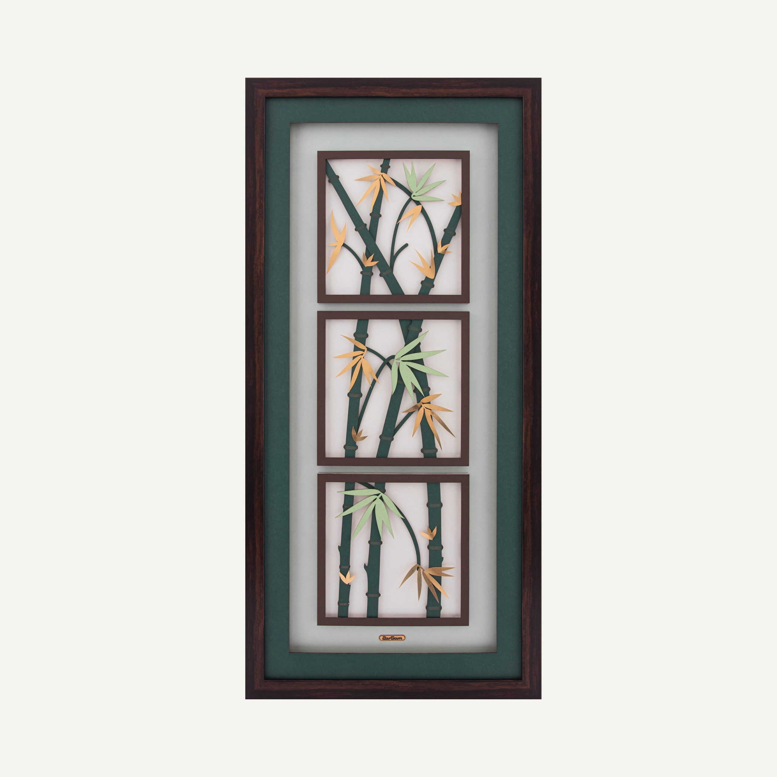 طراحان زرسام در خلق تابلو بامبو، نگاه خود را به طبیعت معطوف کردهاند؛ جایی که زیبایی در سادگی و قدرت در نرمی نهفته است. بامبو با ساقههای بلند و انعطافپذیرش، همواره نمادی از رشد در مسیر سختیهاست. در این اثر، فرم باریک و عمودی تابلو با الهام از قامت بامبو طراحی شده تا مفهوم «بلندای زندگی» را تداعی کند. درون قابها، ترکیبی از ورق طلای 24 عیار و رنگهای لطیف سبز پستهای و سفید صدفی به کار رفته تا تضادی دلپذیر میان طراوت و شکوه پدید آورد. هر بخش از این تابلو بهگونهای طراحی شده که تداعیکنندهی سه مرحله از رشد در طبیعت باشد؛ از بذر، تا ساقه، تا شکوفایی. زرسام با این طراحی، بامبو را از گیاهی ساده به نمادی از قدرت، آرامش و امید تبدیل کرده است.