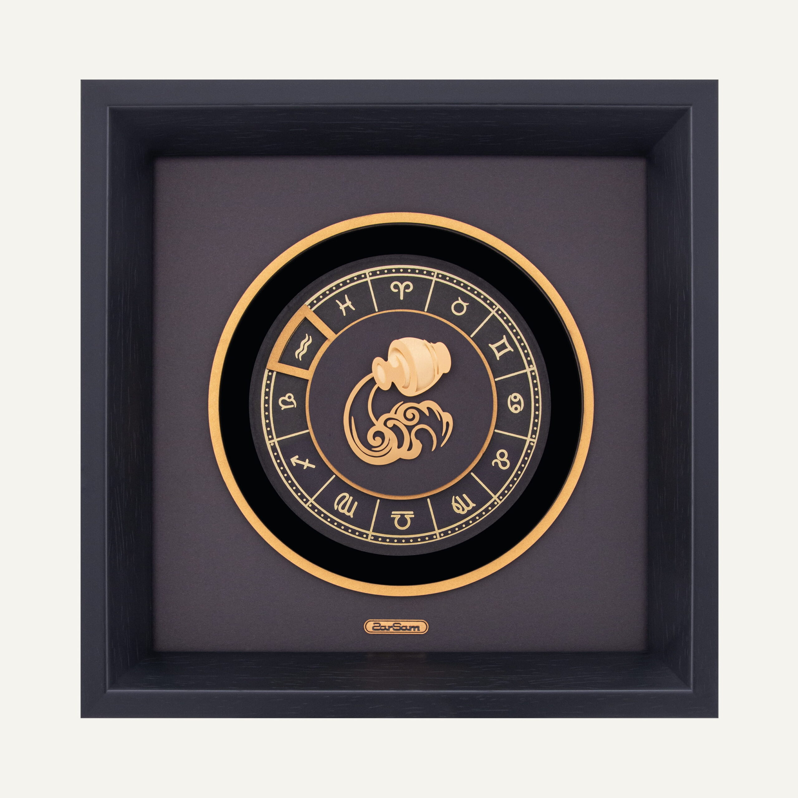 در این اثر، تصویر مرد و دلو با ظرافتی مثالزدنی بر زمینهای مشکی نقش بسته و با ورق طلای 24 عیار اجرا شده است. درخشش طلا در کنار عمق رنگ مشکی، ترکیبی از تفکر و انرژی را القا میکند. خطوط نرم و جاری طراحی، حس حرکت و پویایی آب را به بیننده منتقل میسازد؛ مفهومی از جاری بودن زندگی، نو شدن و بیپایانی.
