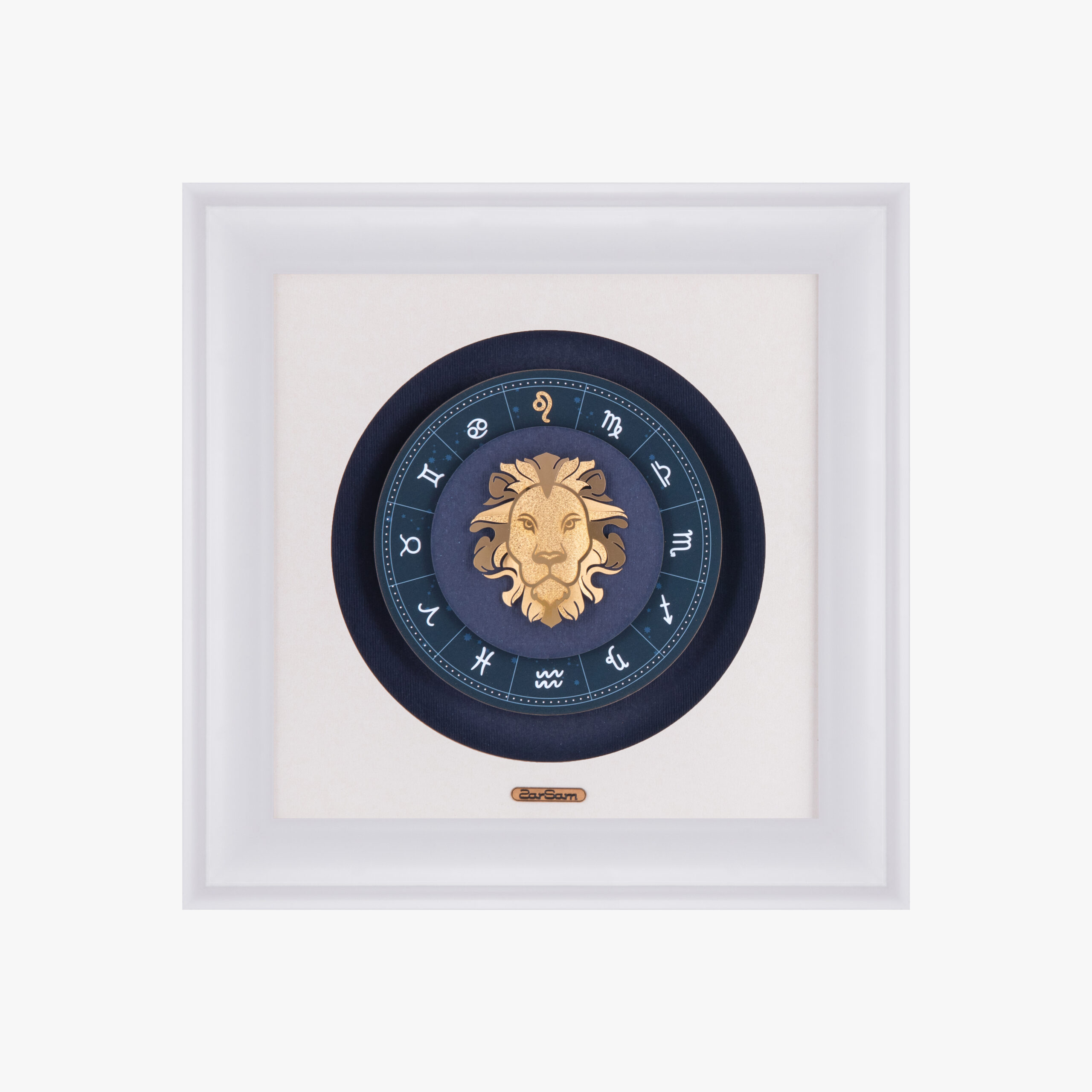 در این محصول طراح با نهایت سادگی و زیبایی، نماد متولد مرداد را که از جنس ورق طلا است در مرکز کار قرار داده و نواری از نماد ماههای مختلف دور عنصر اصلی تابلو طراحی کرده است. متمایز کردن نماد ماه مرداد از بقیه ماهها با ورق طلا از نکات ظریفی ست که طراح در این تابلو اجرا کرده است. این تابلوی شکیل هدیهای مناسب برای متولدین این ماه میباشد.