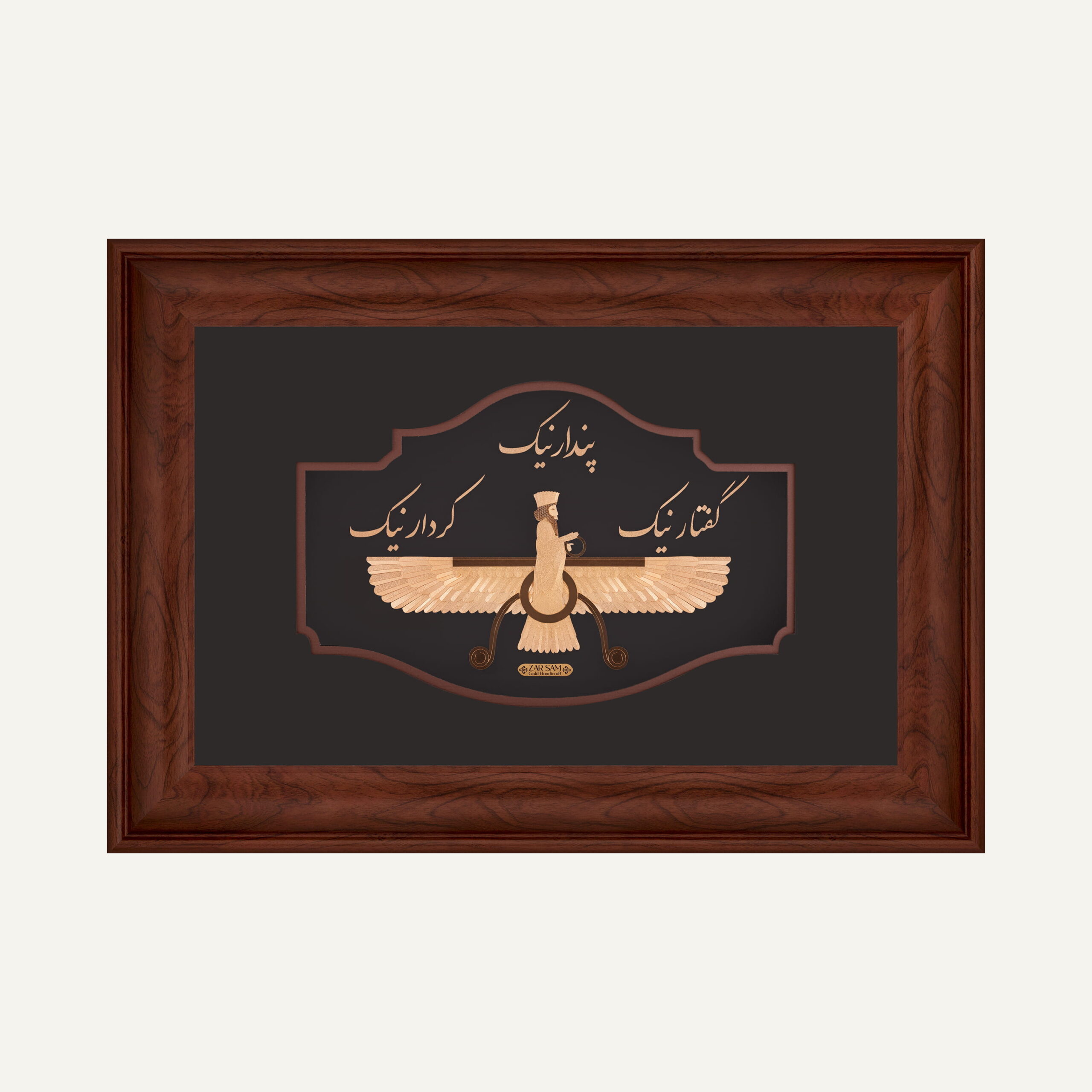 در نماد فروهر دو بال در پهلوها قرار گرفته و هر کدام سه پر دارند. این سه پر نشانه سه نماد «پندار نیک، گفتار نیک، کردار نیک» است. زرتشت که پیامآور پاکی و راستی است همواره تاکید دارد که باید از پلیدیها و ناپاکیها اجتناب کنیم تا زندگی ما سرشار از خیر و نیکی شود. این آموزه در سراسر تاریخ این سرزمین مورد توجه و تاکید بوده است و اشاره دارد که رفتار و کردار ما متاثر از پندار ما است و اول باید تفکر و پندار خویش را اصلاح کنیم زیرا فقط با پندار نیک است که میتوان گفتار و کردار نیک داشت. این تابلو دارای طراحی ساده و زیبایی ست و استفاده از ورق طلا در آن به زیباییاش افزوده است.