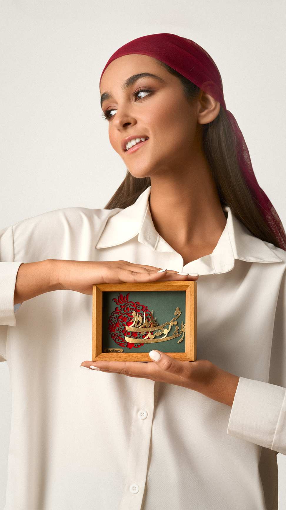 در این تابلوی زیبا طراح با استفاده از عناصر مربوط به شب یلدا همچون انار و رنگهای قرمز و سبز که تداعیکنندهی شب یلداست، محصولی ظریف و چشمنواز طراحی کرده است.