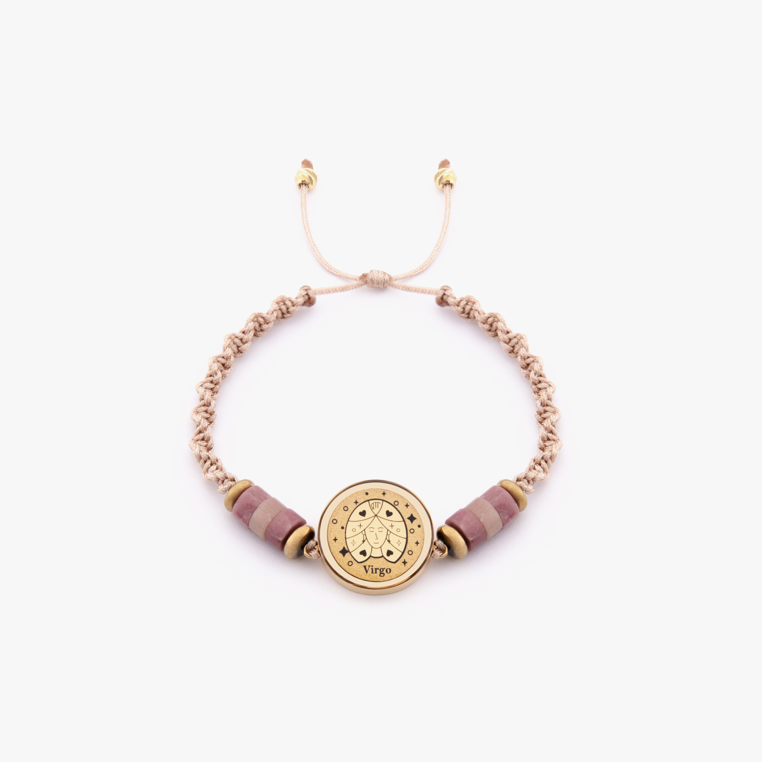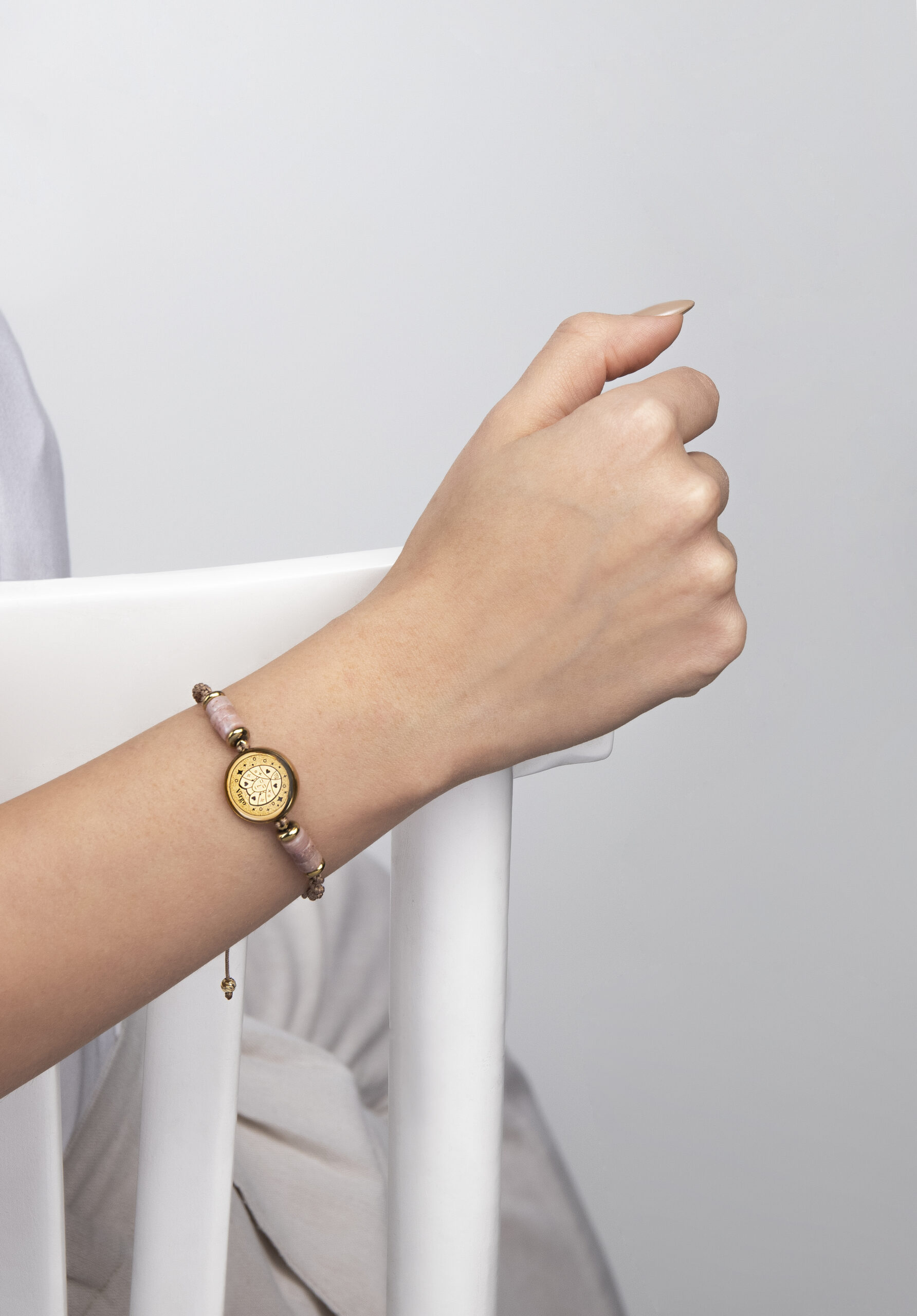 بند دستبند نیز ترکیبی از نخ مقاوم و سنگ رز کوارتز – سنگ اختصاصی شهریورماه – است. این سنگ ارزشمند با رنگ صورتی ملایم خود، نمادی از عشق، آرامش و انرژی مثبت به شمار میرود و زیبایی دستبند را دوچندان کرده است.
