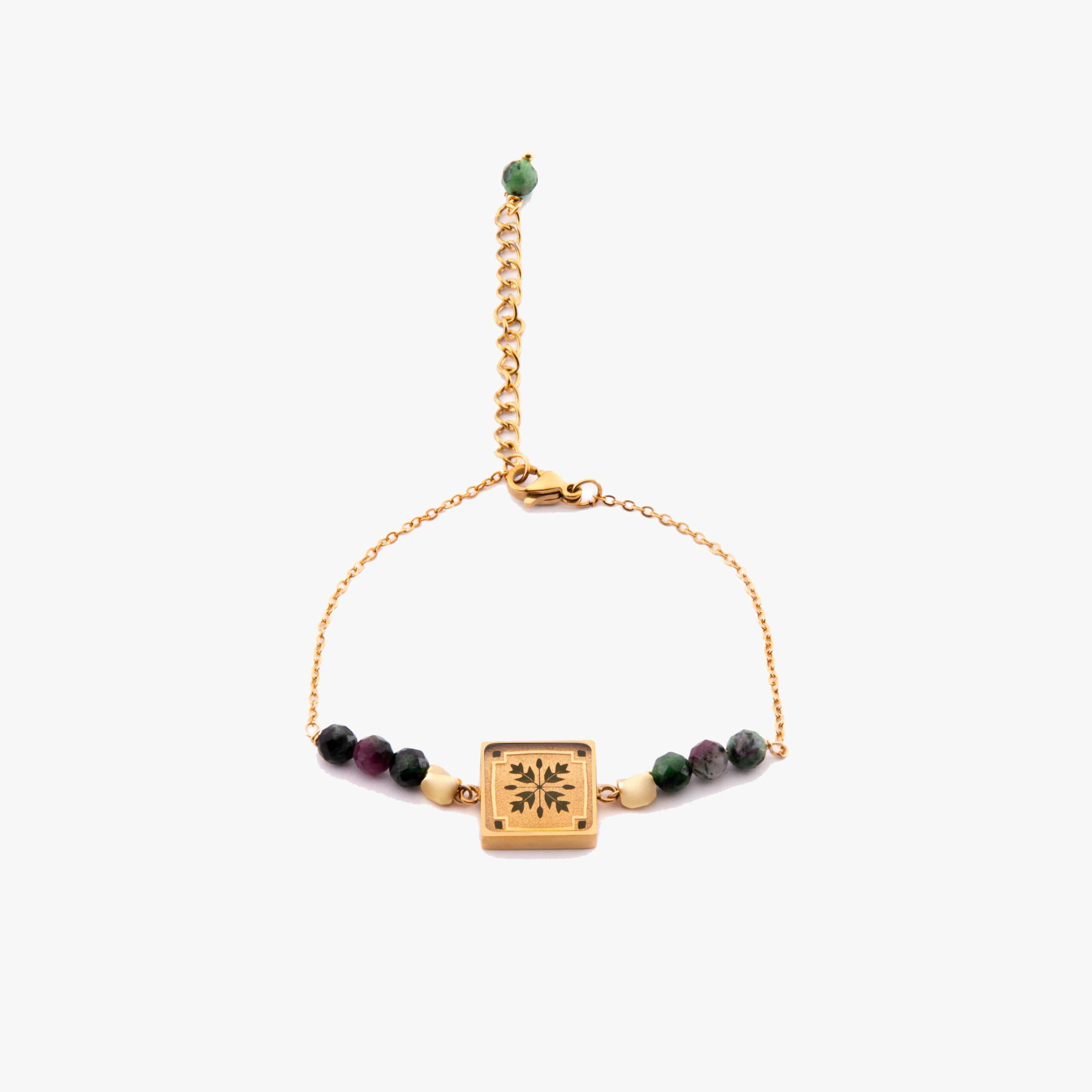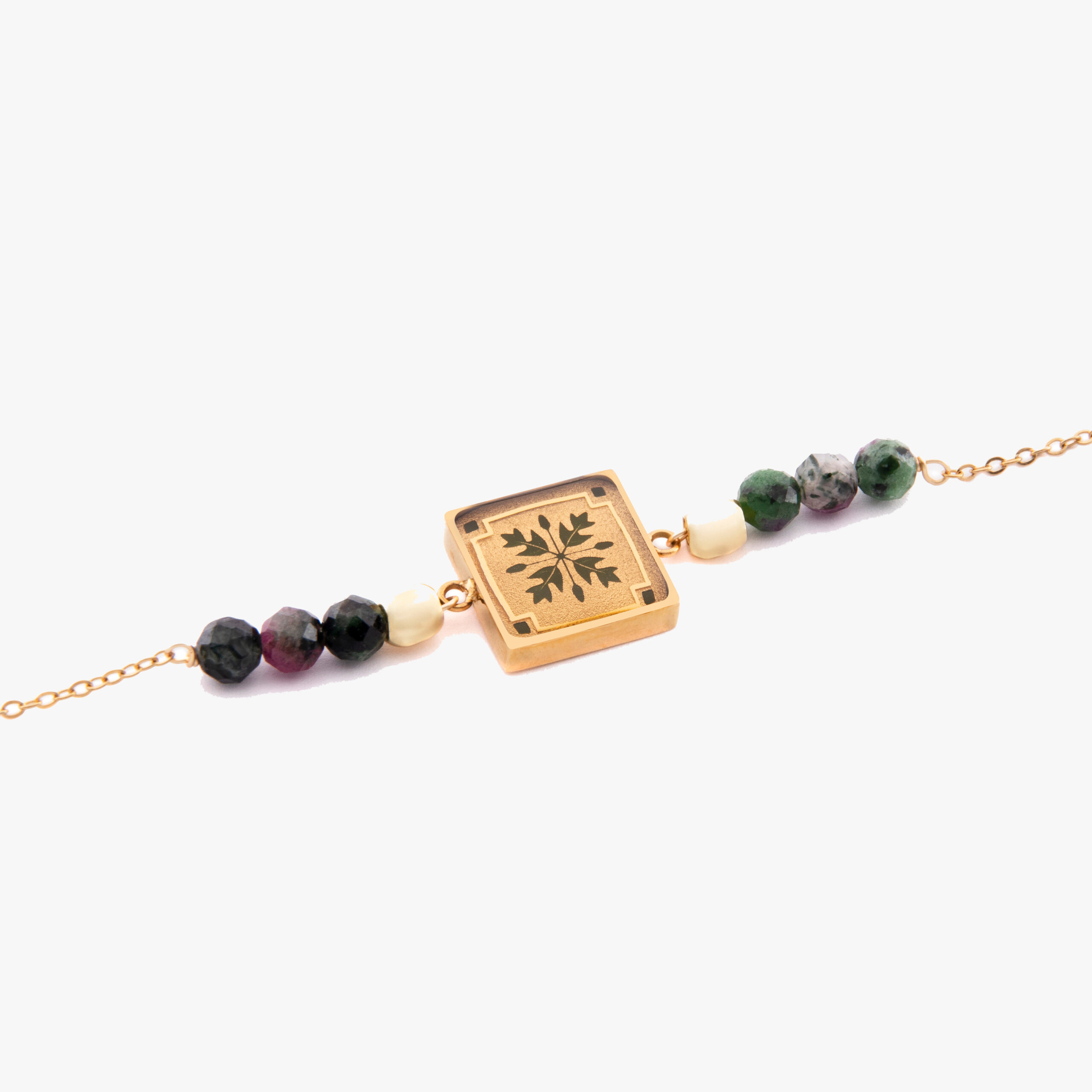 بند این مدل دستبند شیک، به شکلی است که در هر طرف چهار مهره طلایی، سبز و مشکی در دو طرف دستبند به صورت قرینه قرار دارند. مهره های سبز و مشکی زنجیر دستبند چنار از جنس سنگ زئوسیت و مهره های طلایی از جنس استیل آبکاری شده هستند. نحوه باز و بسته شدن این مدل دستبند ورق طلا، به کمک قفل فنری و حلقه است. دستبند مدل برگ از سری یزدان بر روی مچ دست قرار می گیرد و سایز آن با توجه به سلیقه شما در هنگام بسته شدن قابل تغییر است.