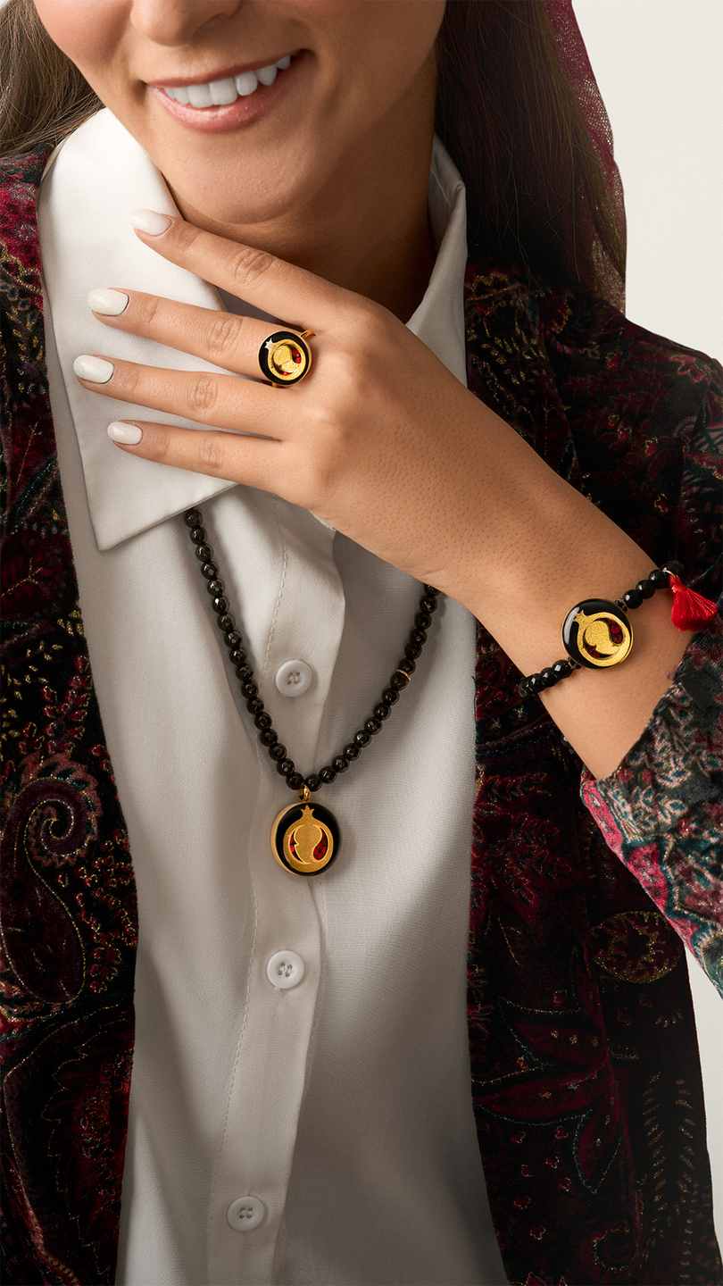 در طراحی گردنبند انار تصویر انار که یکی از سمبلهای مهم سفره شب یلدا به حساب می آید و به سبب دانههای فراوانش نماد باروری و تکثیر نسل و حاصل خیزی و وفور نعمت است، استفاده کردیم. انار جایگاه خاصی در ادب و هنر فارسی دارد و در فرهنگ های مختلف، نماد فراوانی، برکت و جاودانگی است و شاید همین امر یکی از دلایل جایگاه ویژه آن نزد ایرانی ها خصوصا در مناسبتی مانند شب چله یا شب یلدا باشد. در اساطیر ارمنی نیز انار نماد فراوانی، شادی، ازدواج، باروری و خوشبختی است و آن ها انار را محافظ در برابر چشم بد می دانند.