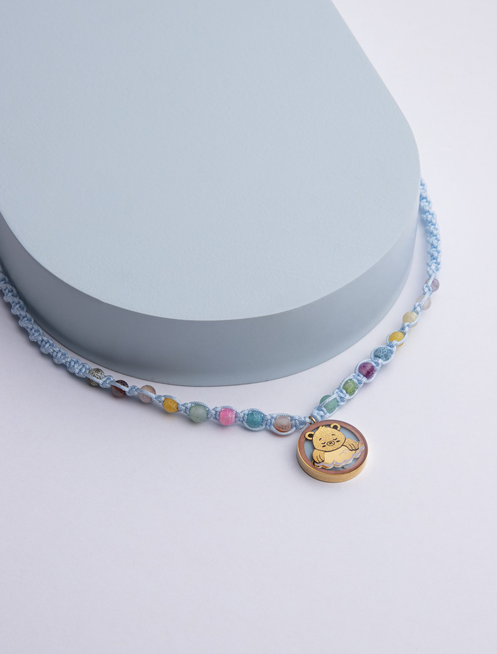 گردنبند پاندا از سری شادی با ورق طلای 24 عیار و سنگ آکوامارین توسط دستان هنرمندان برند زرسام بافته می شود. گردنبند پاندا از سری گردنبندهای فانتزی است که به دلیل پلاک خرسی و مهره های رنگی که در بند دستبافت آن قرار دارد از اکسسوری های کودکانه زرسام به شمار می آید. ورق طلای 24 عیار در پلاک گردنبند به شکل خرس پاندا برش می خورد و روی زمینه رنگی پلاک قرار می گیرد.