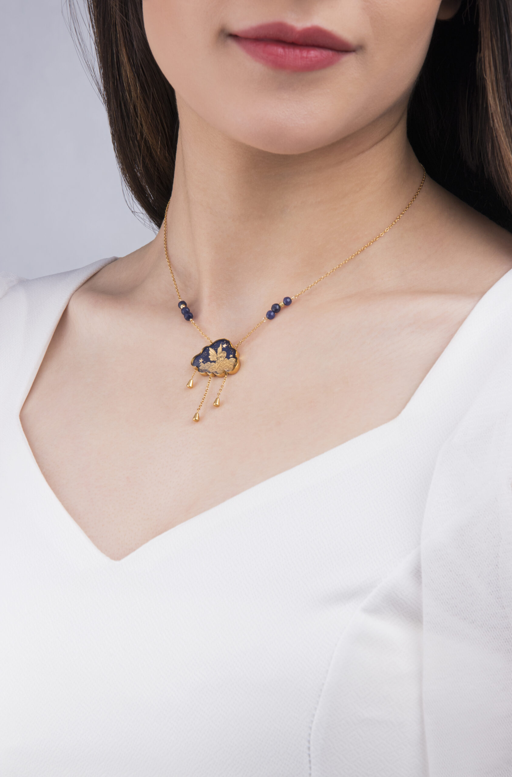 پولک گردنبند از جنس استیل ۳۱۶ ساخته شده و با تکنولوژی PVD طلا آبکاری شده است تا رنگ طلایی آن در طول زمان ثابت و ماندگار باقی بماند. شکل پولک بهصورت ابر طراحی شده و سایز آن ۲.۵ در ۱.۹ سانتیمتر است؛ فرمی نرم و شناور که با مفهوم فرشته و آسمان هماهنگی دارد. جنس زمینه طرح از ورق طلای 24 عیار تشکیل شده و رنگ زمینه ترکیبی از طلایی و سرمهای است. در این گردنبند از سنگ لاجورد تراش با اندازه ۴ میلیمتر و رنگ سرمهای استفاده شده؛ سنگی که از دیرباز نماد خرد، آرامش و عمق درونی بوده است. وزن تقریبی محصول حدود ۶ گرم است که حس سبکی و ظرافت را در کنار کیفیت ساخت منتقل میکند.
