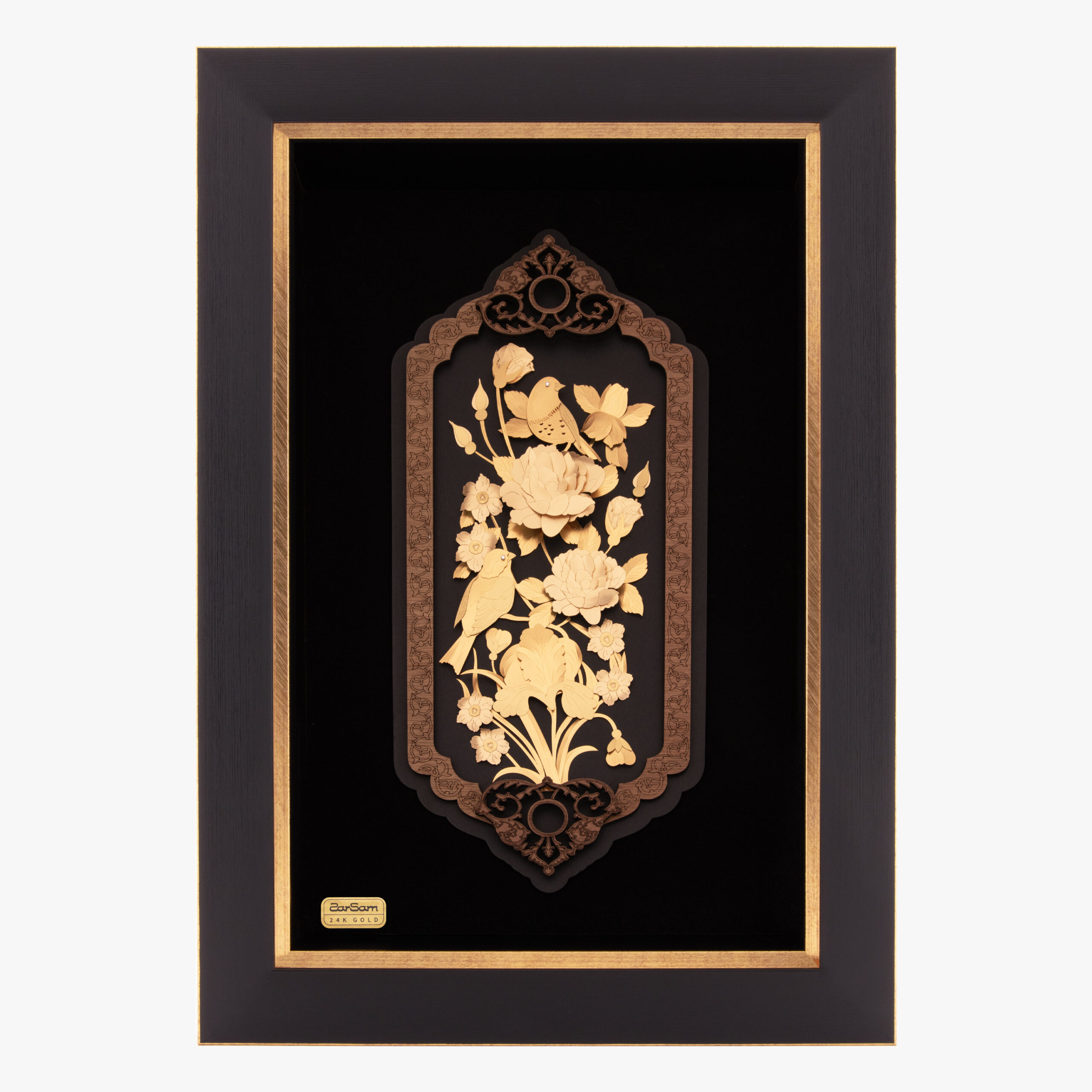 در بخش داخلی تابلو، طرح گل و مرغ با استفاده از ورق طلای 24 عیار بر زمینهای مشکی نقش بسته است. تضاد رنگ طلایی و مشکی، جلوهای لوکس و چشمگیر به اثر بخشیده و باعث شده نقشها با درخششی بیمانند به نمایش درآیند. همچنین استفاده از متریالهایی چون مقوای جیردار و چوب کیفیت و اصالت بیشتری به تابلو بخشیده است.