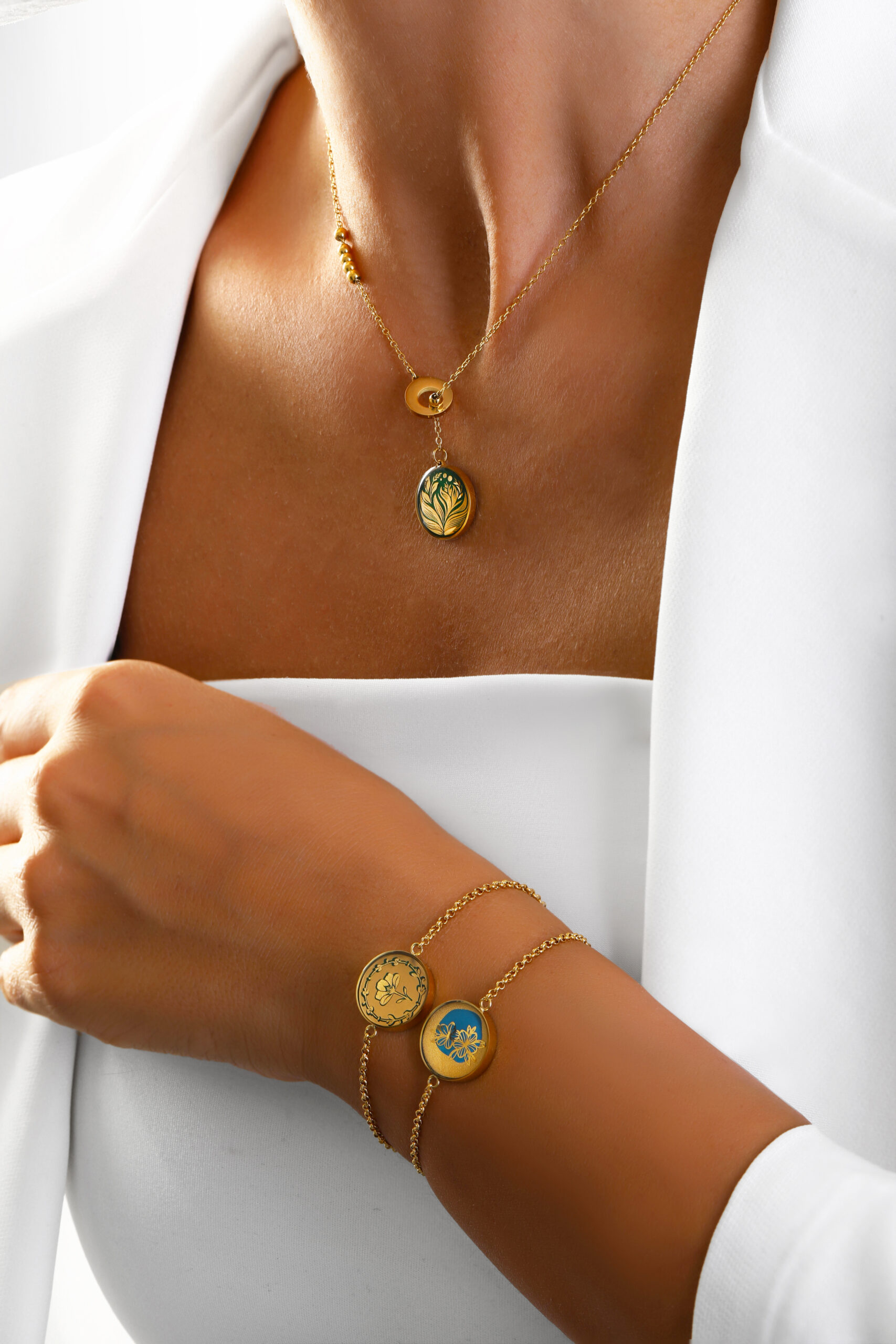 ورق طلای ۲۴ عیار در بخش اصلی و شاخص طراحی زیورآلات بهکار رفته و بسته به مدل، بهصورت نماد یا المان تزئینی استفاده میشود.