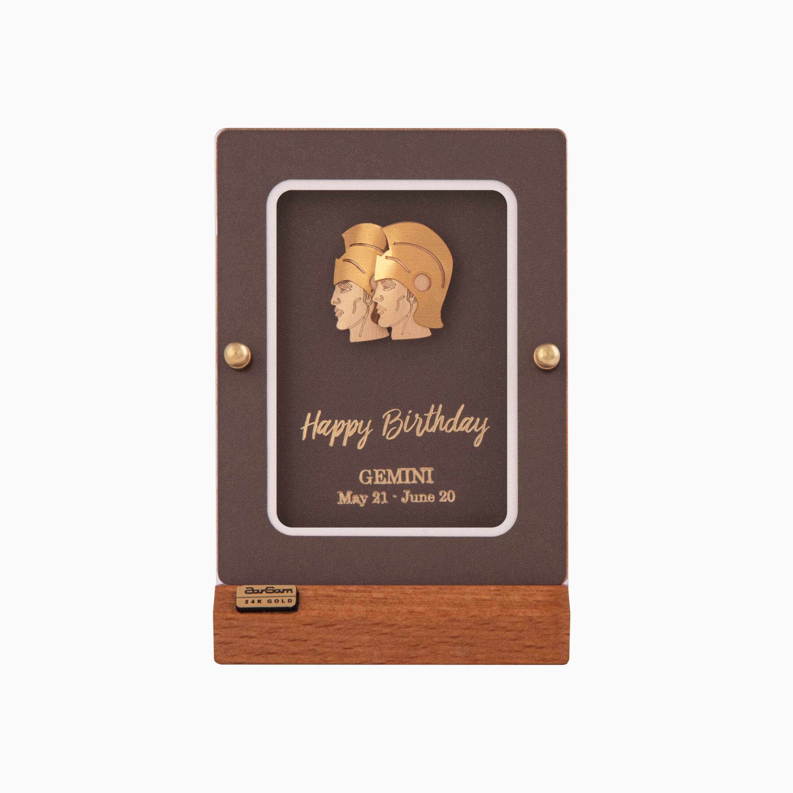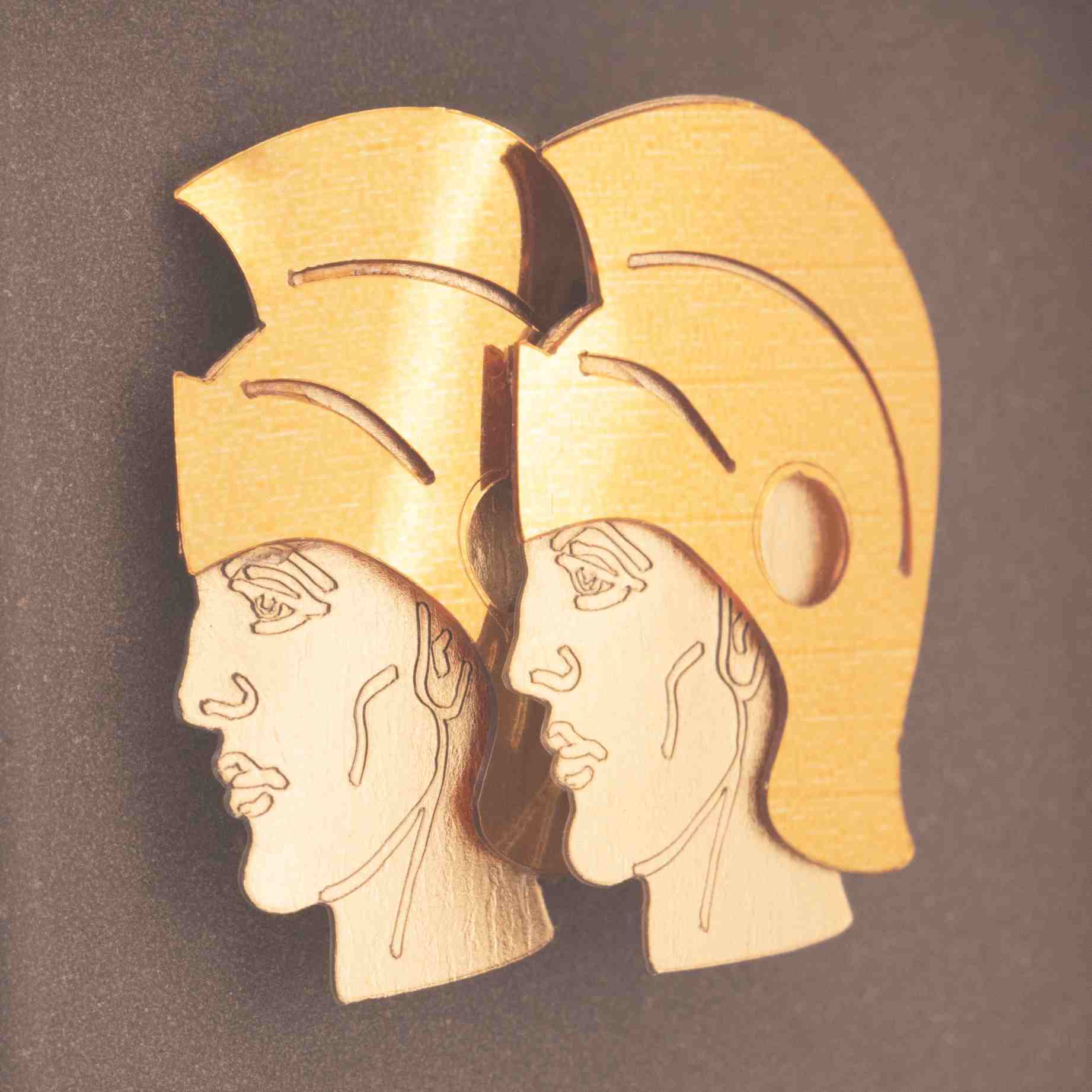 درخشش ورق طلای 24 عیار در پسزمینهی قهوهای، حس عمق و تفکر را منتقل میکند؛ گویی دو چهره، در گفتوگویی درونی میان منطق و احساس غرق شدهاند. رنگ طلایی، نمادی از خرد و دانایی، و قهوهای، یادآور ثبات و ریشه است؛ ترکیبی که روح متعادل و انعطافپذیر متولدین خرداد را بازتاب میدهد.