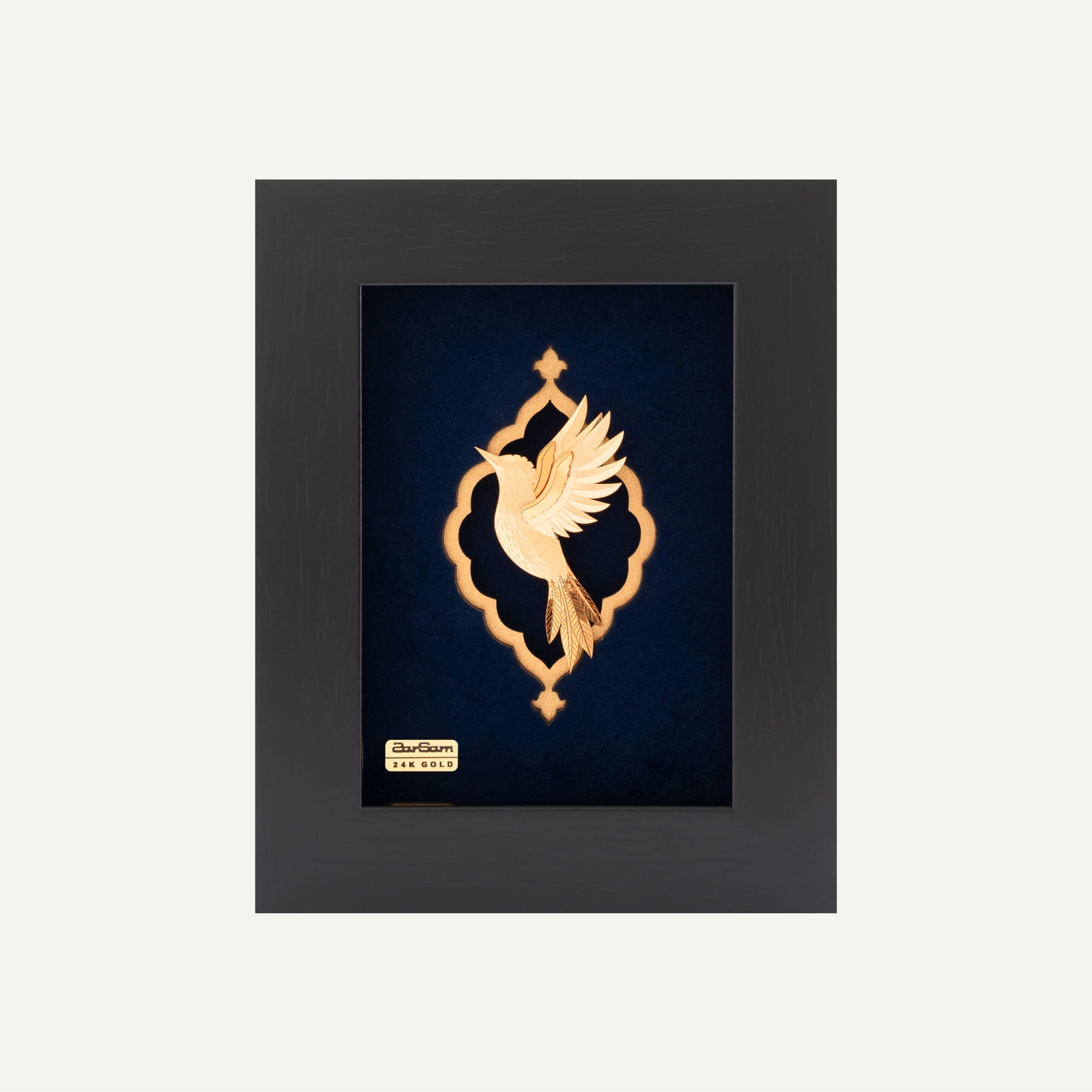 طرح این تابلو، ادای احترامی شاعرانه به نقش نمادین هدهد در ادبیات عرفانی پارسی است. در شاهکار عطار، هدهد راهنمای مرغان (روحهای جوینده) به سوی سیمرغ (حقیقت مطلق) است؛ میانجیای بین عالم خاکی و ملکوت. طراحان زرسام با برداشتی مدرن و مینیمال، این پرنده خردمند را در ترکیببندیای ساده و تاثیرگذار بازآفرینی کردهاند. استفاده ظریف از ورق طلای ۲۴ عیار برای بدن هدهد، بر ارزش والا و نورانی رسالت این راهنمای نمادین تأکید میکند. زمینه سرمهای عمیق از جنس جیر، حس وهمانگیزی، عمق و شکوه شب را القا میکند و بستری ایدهآل برای درخشش طلای هدهد فراهم میآورد، گویی این پرنده از دل تاریکیهای نادانی، نور حقیقت را نمایان میسازد.