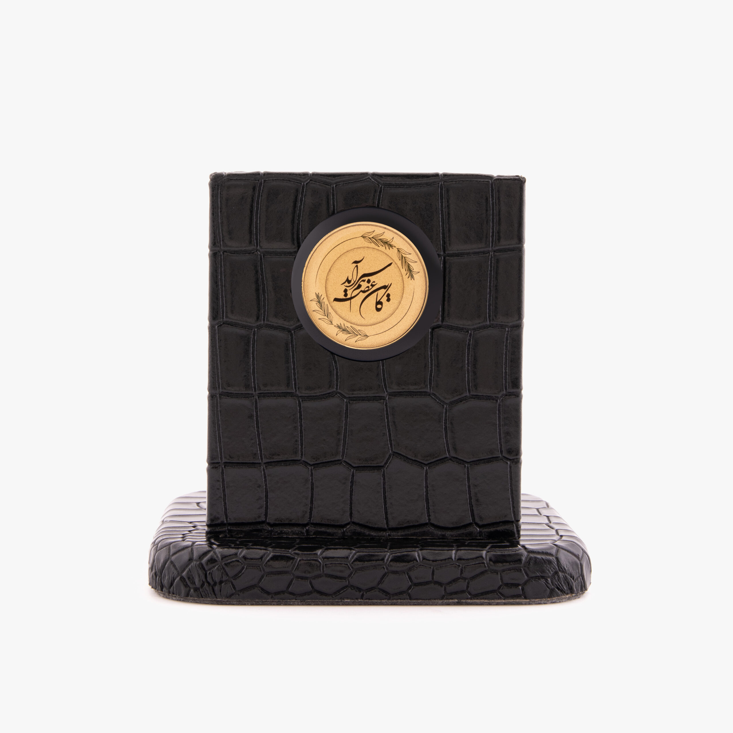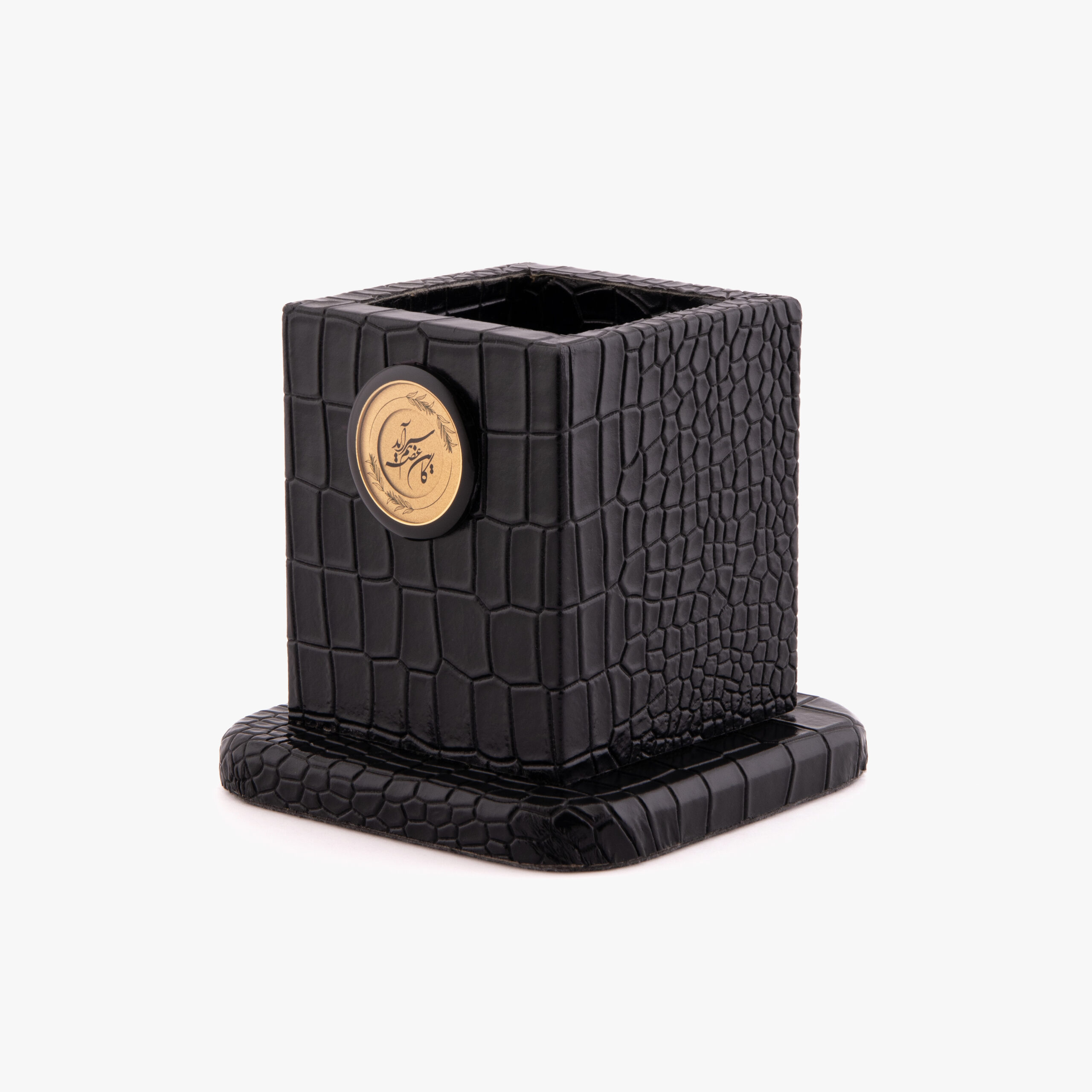 این محصول از نوع جاقلمی بوده و با ابعاد ۱۱×۱۱×۱۱ سانتیمتر طراحی شده است؛ ابعادی متناسب که هم کاربردی است و هم جلوهای دکوراتیو و منظم به فضای کار یا مطالعه میبخشد. جنس بدنه از چرم انتخاب شده و رنگ بدنه مشکی است تا حس وقار، رسمیت و دوام را منتقل کند.