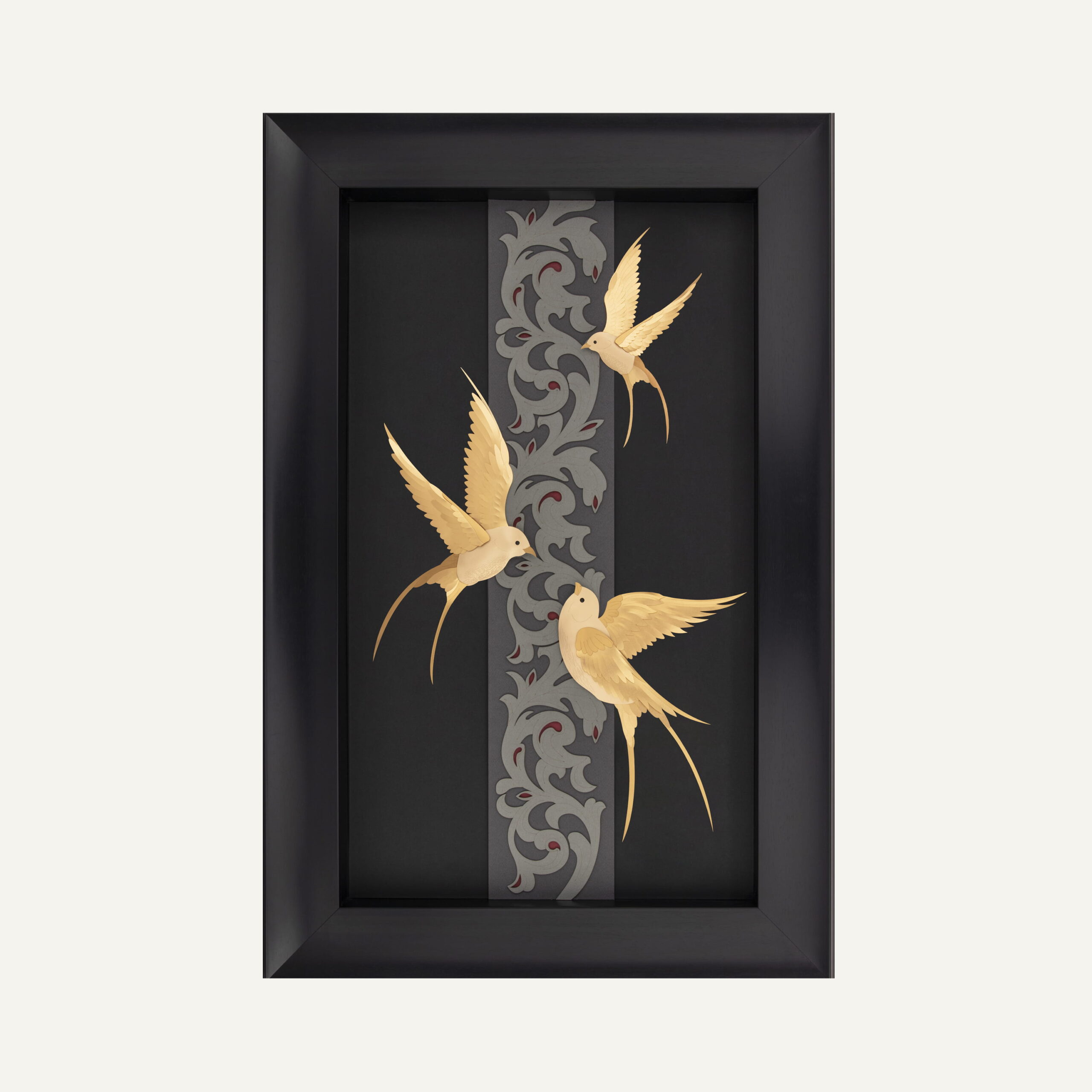 ابعاد بخش اصلی طرح که با ورق طلای خالص تزئین شده، ۶۷ در ۲۰ سانتیمتر است. درخشش طلا روی زمینه طوسی، تضادی ملایم و فاخر ایجاد میکند که نگاه را به حرکت و پرواز پرندهها معطوف میسازد.