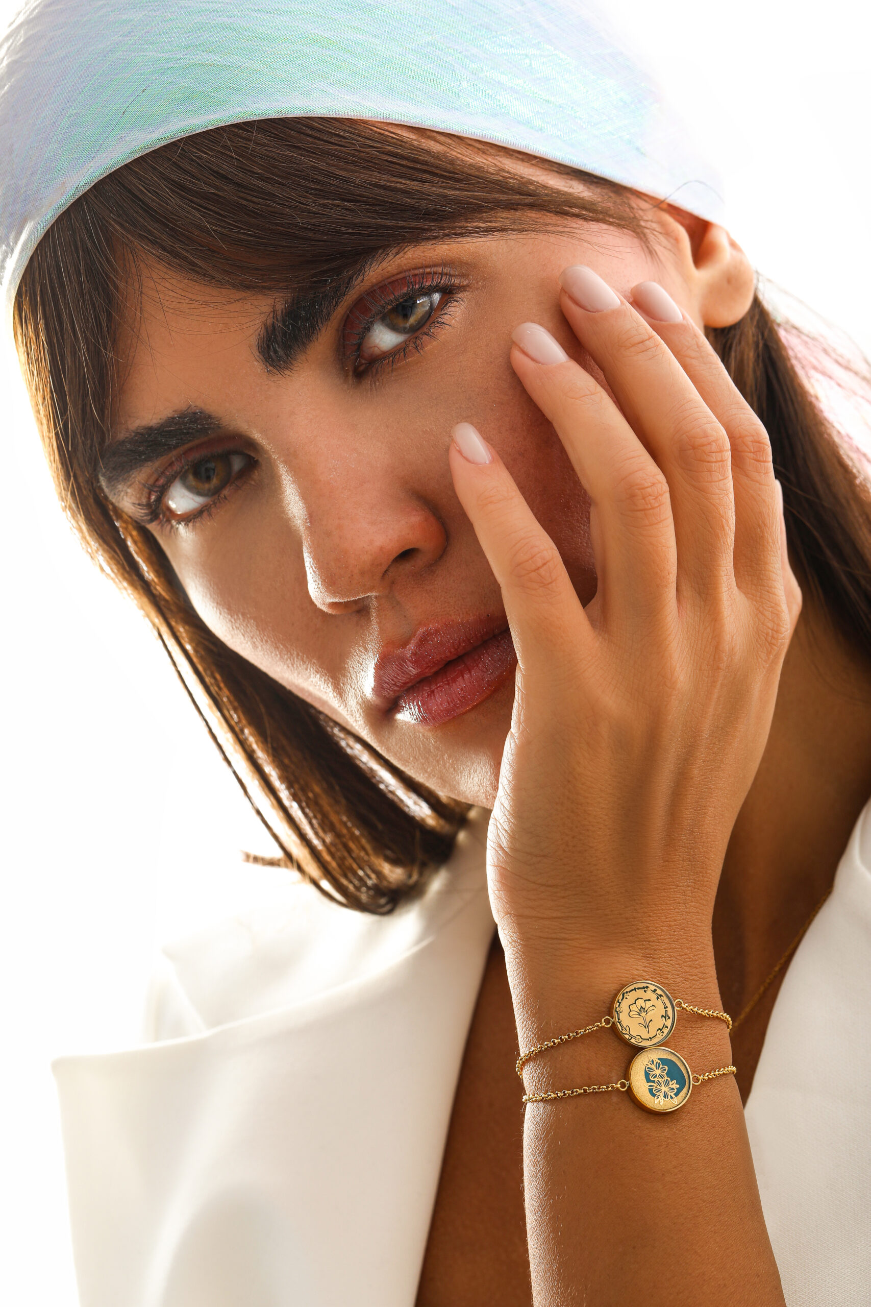 مهمترین ویژگی این دستبند، استفاده از ورق طلای 24 عیار در زمینه طرح است؛ طلا در مرکز پولک، تحت رزین شفاف قرار گرفته تا در برابر خطوخش محافظت شود و درخشش آن در کنار رنگ سبز و طلایی مجموعه، جلوهای بسیار چشمگیر ایجاد کند.