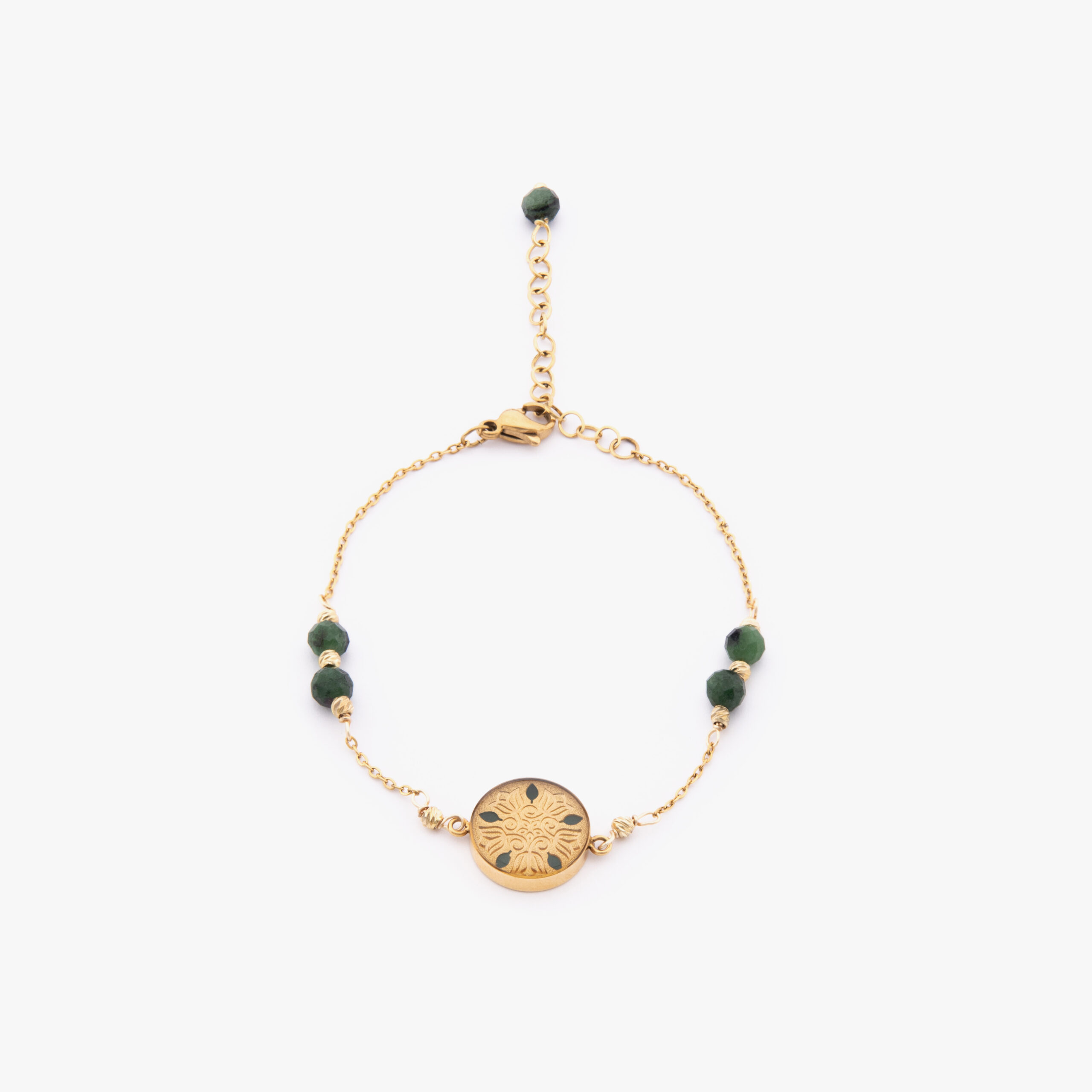 در ترکیب این زیور زیبا از پنج مهره سنگ زئوسیت تراشخورده سبز رنگ استفاده شده است. این سنگها، با قطر ۴ میلیمتر، بهعنوان نمادی از انرژی، طبیعت و طراوت، در کنار طلای درخشان، هارمونی رنگی دلنشینی ایجاد کردهاند. سبزی زئوسیت در کنار طلای گرم، دستبند مروا را به اثری هنری و متفاوت تبدیل کرده که نهتنها چشمنواز بلکه پرانرژی و الهامبخش است.