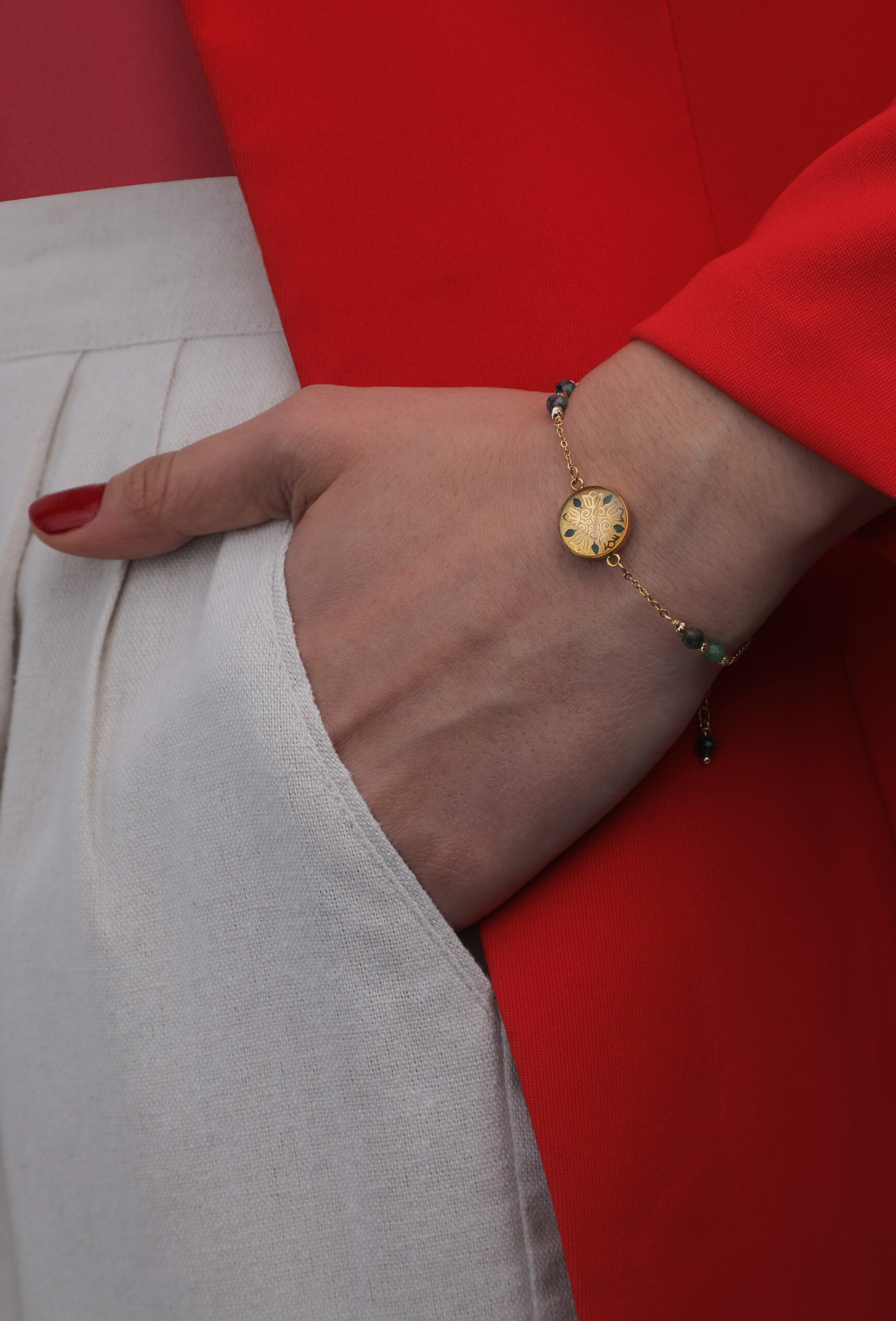 پلاک دایرهایشکل این دستبند با قطر 1.3 سانتیمتر، با دقت و ظرافت بالا از استیل ۳۱۶ ساخته شده و با آبکاری PVD طلای ۱۸ عیار پوشیده شده است. اما آنچه این زیور را خاص میسازد، استفاده از ورق طلای خالص ۲۴ عیار در زمینهی طرح است. این ورق طلا، طرح برگها را بر بستر سبز و طلایی زنده میکند و با پوشش رزین شفاف، جلوهای چشمنواز و ماندگار به آن میبخشد.