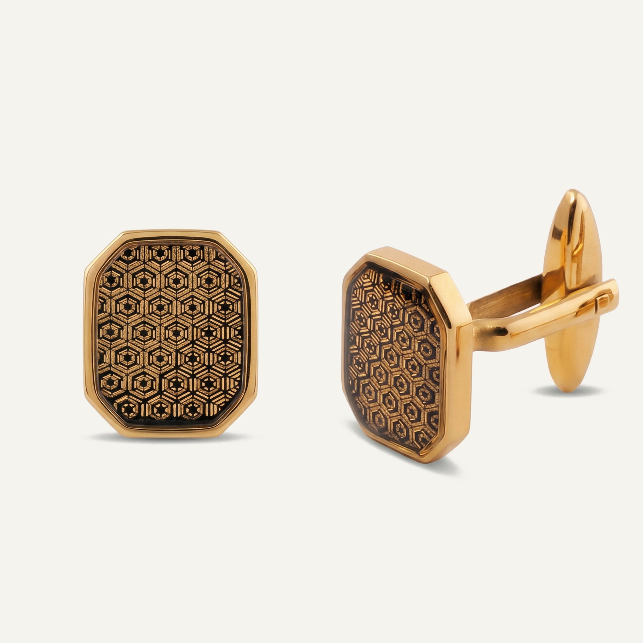 دکمه سردست ورق طلا مردانه نقشینه سری خشتی، تلفیقی از هندسه اصیل ایرانی، طراحی دقیق و متریال ارزشمند است. استفاده از ورق طلای 24 عیار در کنار فرم هشتضلعی و نقشهای الهامگرفته از هنر سنتی، این محصول را به اکسسوریای متمایز برای آقایانی تبدیل کرده که به وقار، نظم و ریشههای فرهنگی اهمیت میدهند؛ دکمه سردستی که هم در استایل شخصی و هم بهعنوان هدیه، حضوری ماندگار و قابل احترام دارد.