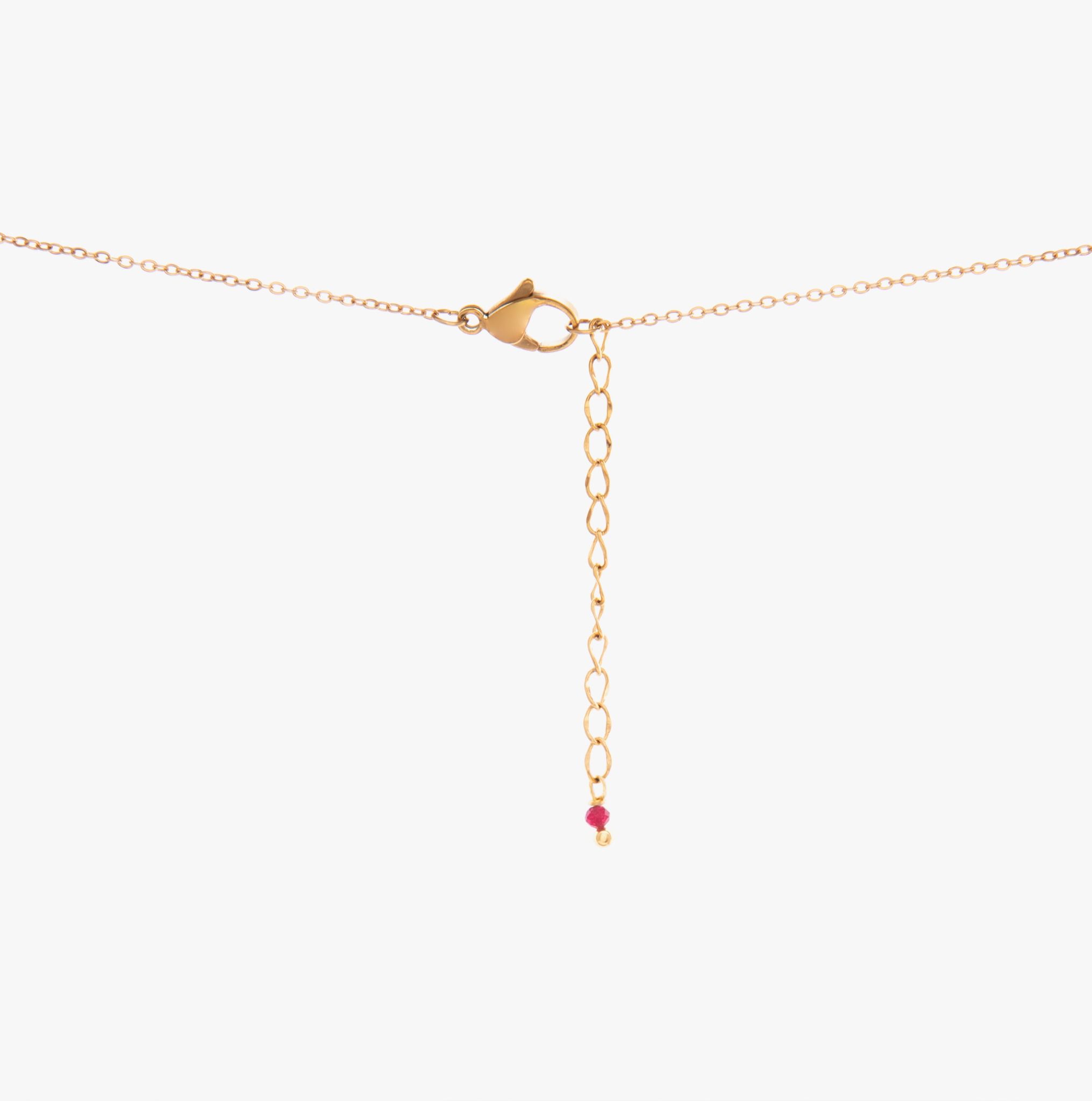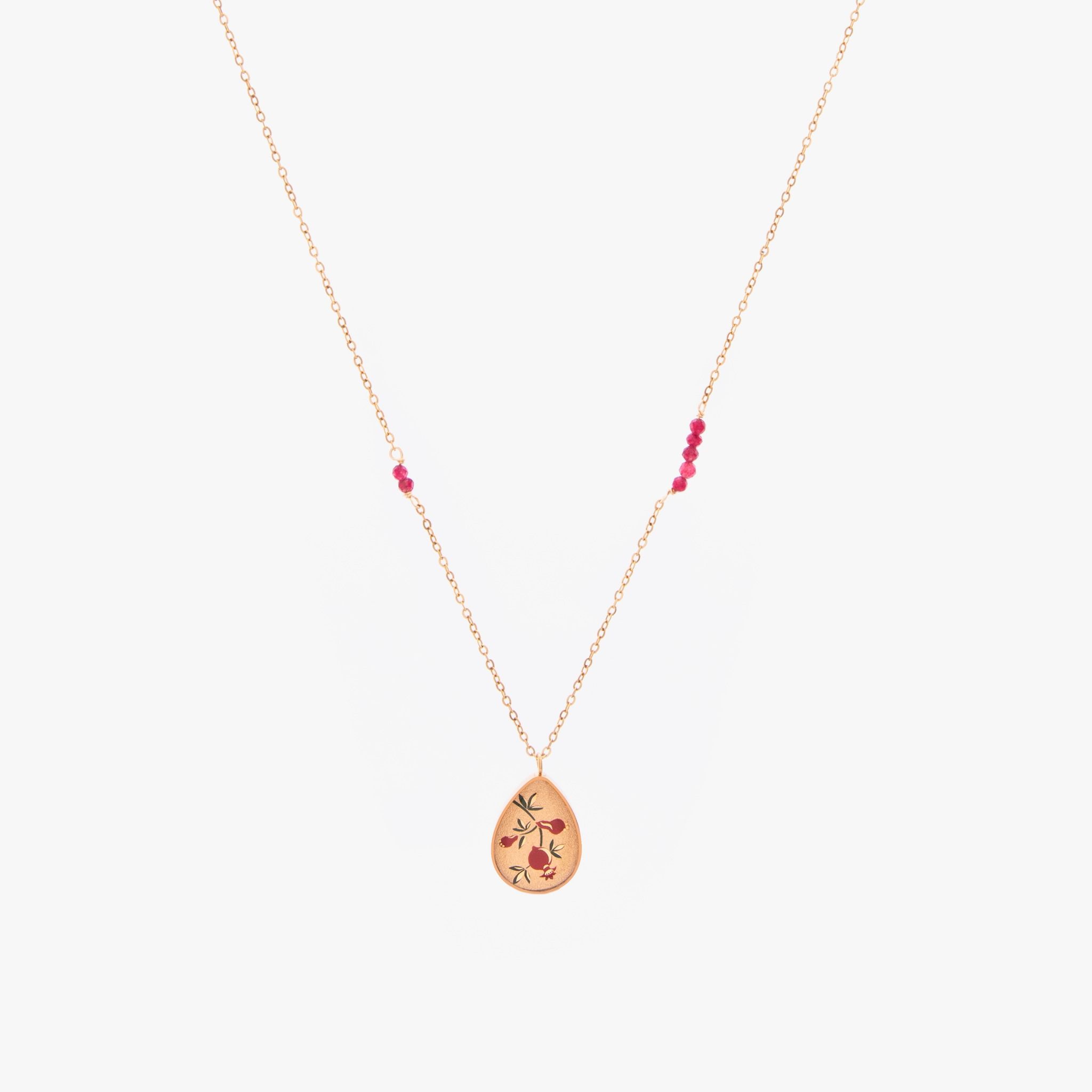پولک این گردنبند از جنس استیل ۳۱۶ است و با تکنولوژی PVD طلا آبکاری شده؛ شکل پولک «اشک» بوده و سایز آن ۱.۳ در ۱.۸ سانتیمتر است.این ابعاد باعث میشود گردنبند روی گردن ظریف به نظر برسد اما همچنان خوانایی طرح را حفظ کند. زمینهی اصلی طرح از ورق طلای 24 عیار ساخته شده و رنگ زمینه طرح طلایی، سبز و قرمز است. وجود سنگ «جید قرمز تراش ۲» با اندازه ۲ میلیمتر و رنگ قرمز نیز دقیقاً در راستای هویت انار تعریف شده و کمک میکند محصول از نظر رنگی، یک امضای مشخص و جذاب داشته باشد.وزن گردنبند حدود ۴ گرم ذکر شده که باعث میشود سبک و مناسب استفاده طولانیمدت باشد.