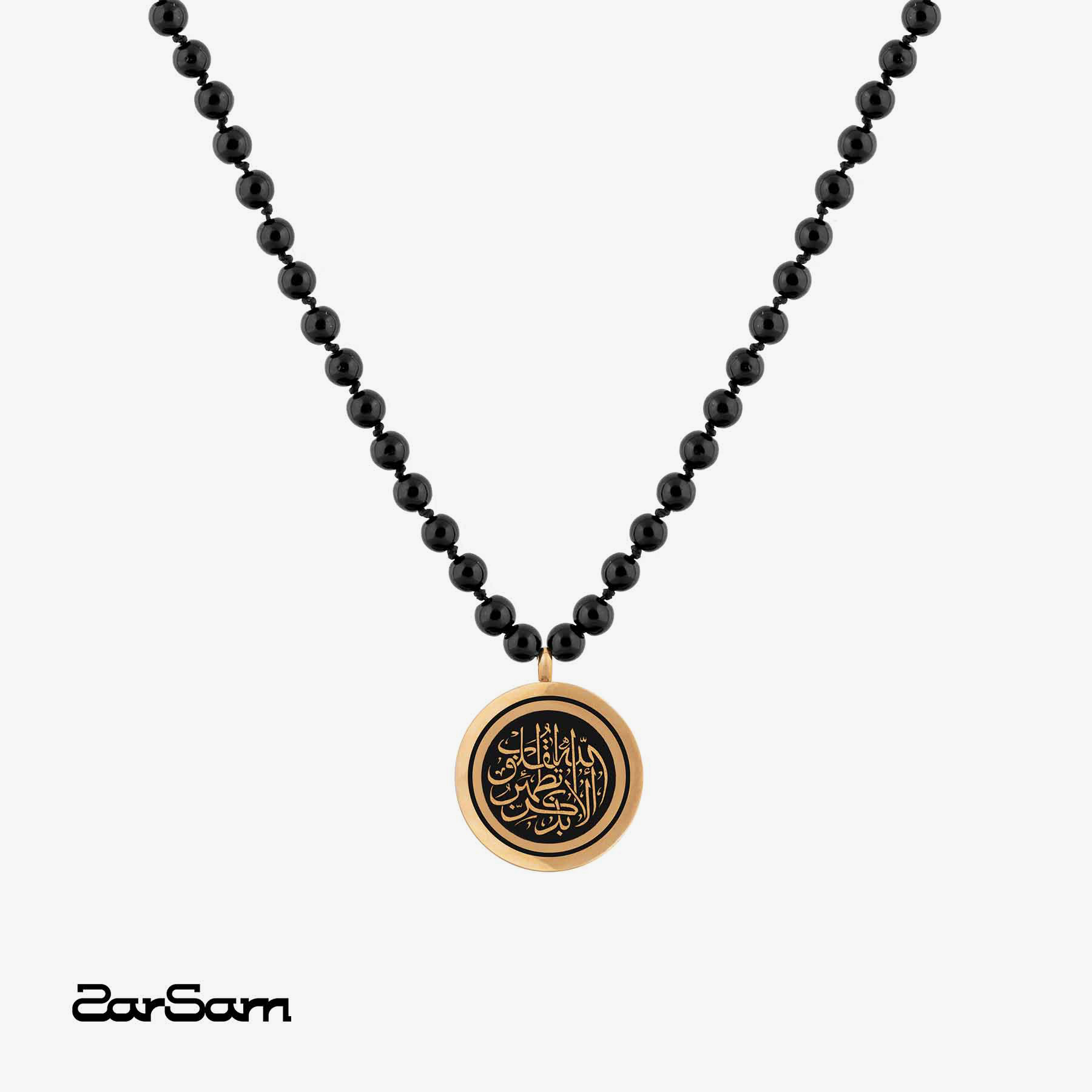 طراح با استفاده از این آیه ی آرامش دهنده با فونت کوفی و چیدمان مدور در این گردنبد محصولی زیبا و چشم نواز خلق کرده است. آیه الا بذکر الله تطمئن القلوب با ورق طلا طراحی شده و سنگ اونیکس به جای زنجیر به کار رفته است.