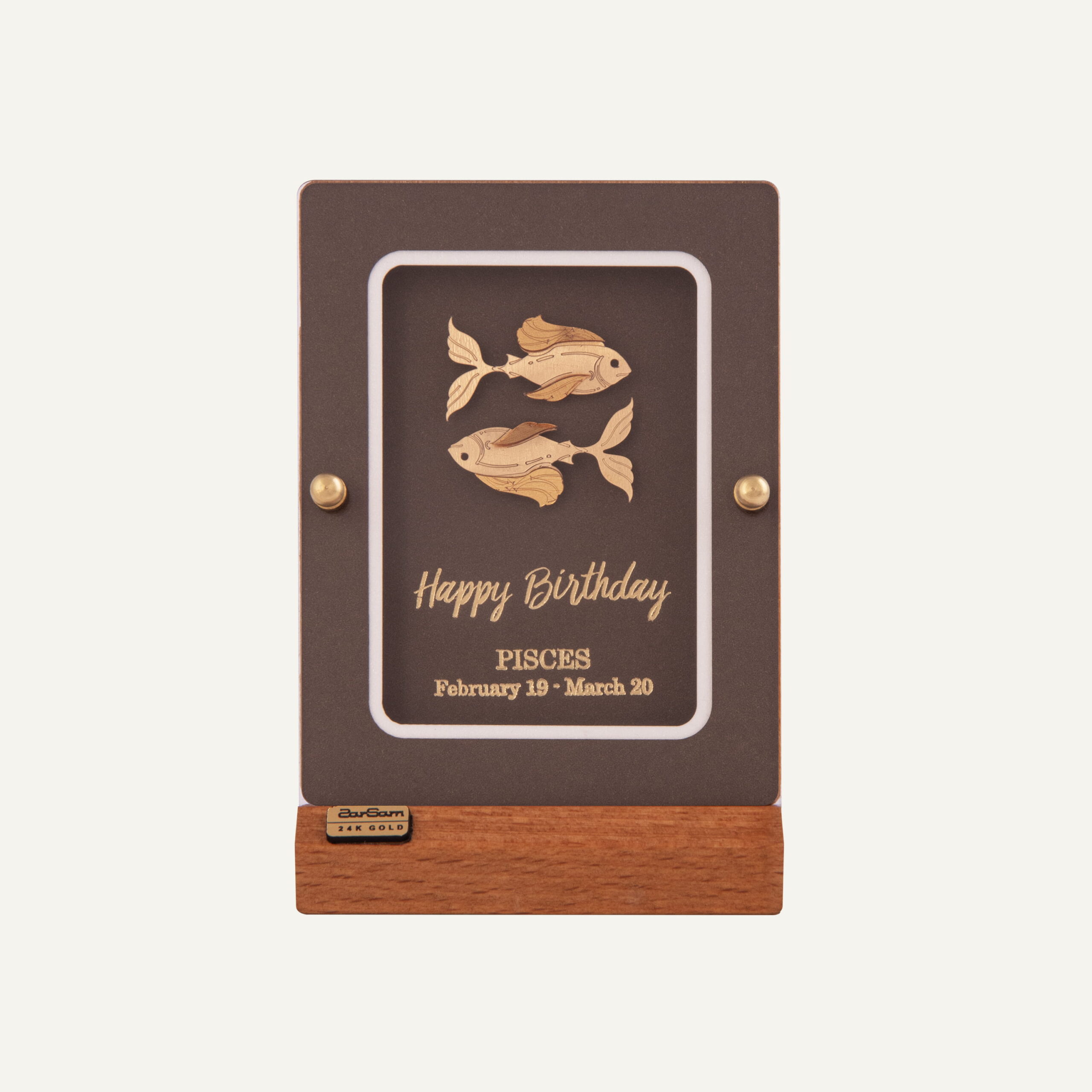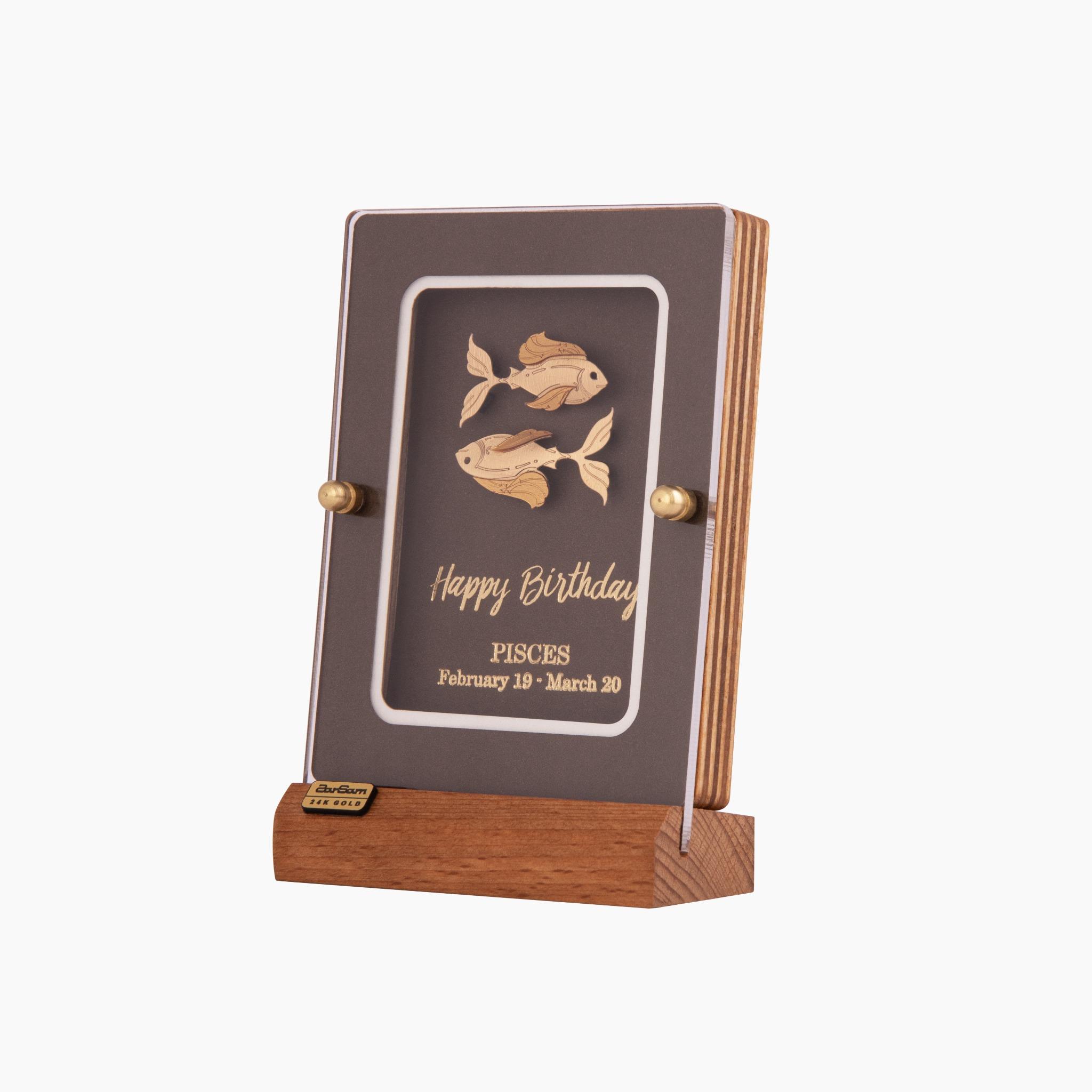 تابلو طلا ماه تولد اسفند سری ماهان با ابعاد ۹×۷×۱.۵ سانتیمتر طراحی شده و از نوع رومیزی است. قاب و پایهی آن از چوب طبیعی قهوهای ساخته شدهاند تا هماهنگی کامل با رنگ و حس طبیعی طرح ایجاد شود.