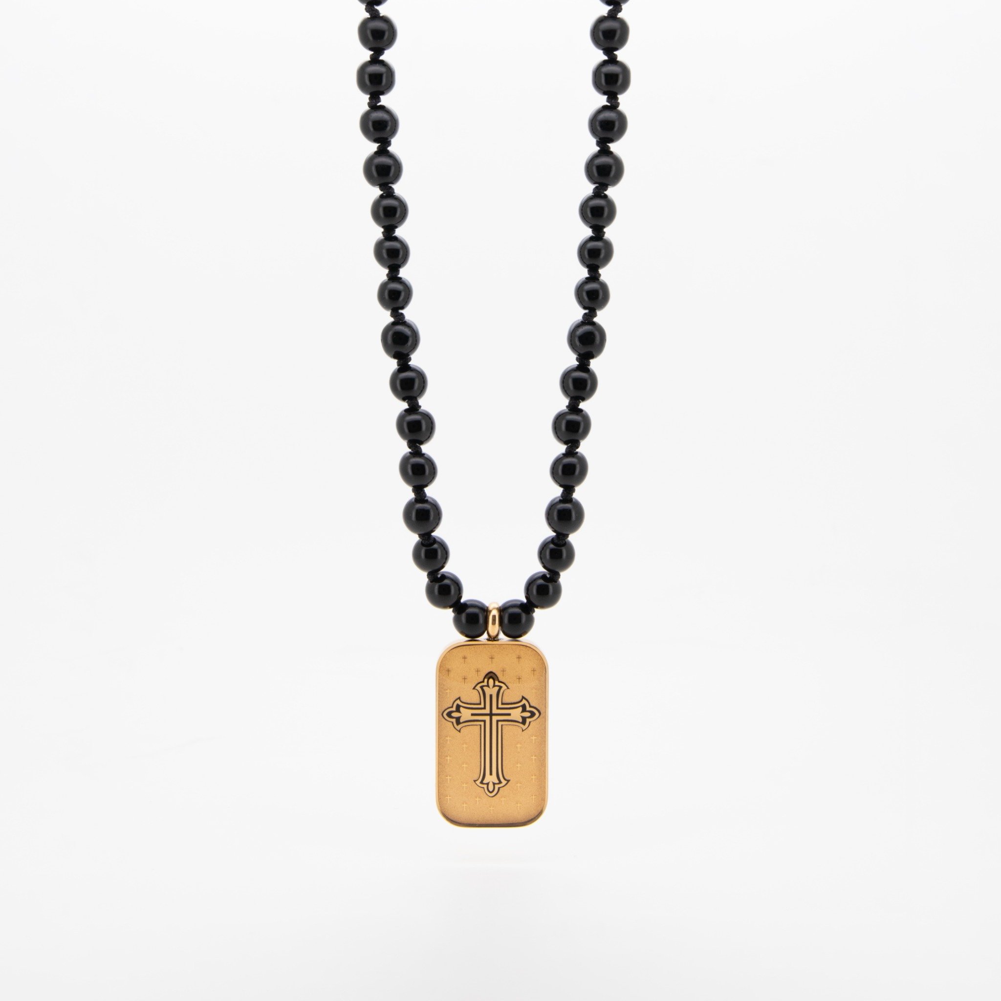زمینهی اصلی طرح از ورق طلای 24 عیار تشکیل شده که مهمترین شاخصه ارزشمند این گردنبند بهشمار میآید. حضور طلا در مرکز طراحی، به محصول جلوهای فاخر و ماندگار میبخشد و آن را از زیورآلات صرفاً فلزی متمایز میکند. در کنار طلا، از سنگ اونیکس ساده با قطر ۶ میلیمتر و رنگ مشکی استفاده شده است؛ سنگی که در زیورآلات مردانه نماد قدرت، تمرکز و ثبات درونی شناخته میشود و هماهنگی کاملی با رنگبندی و مفهوم کلی گردنبند دارد. وزن تقریبی محصول حدود ۴۰ گرم است که حس استحکام، کیفیت و ارزش را بهخوبی منتقل میکند.