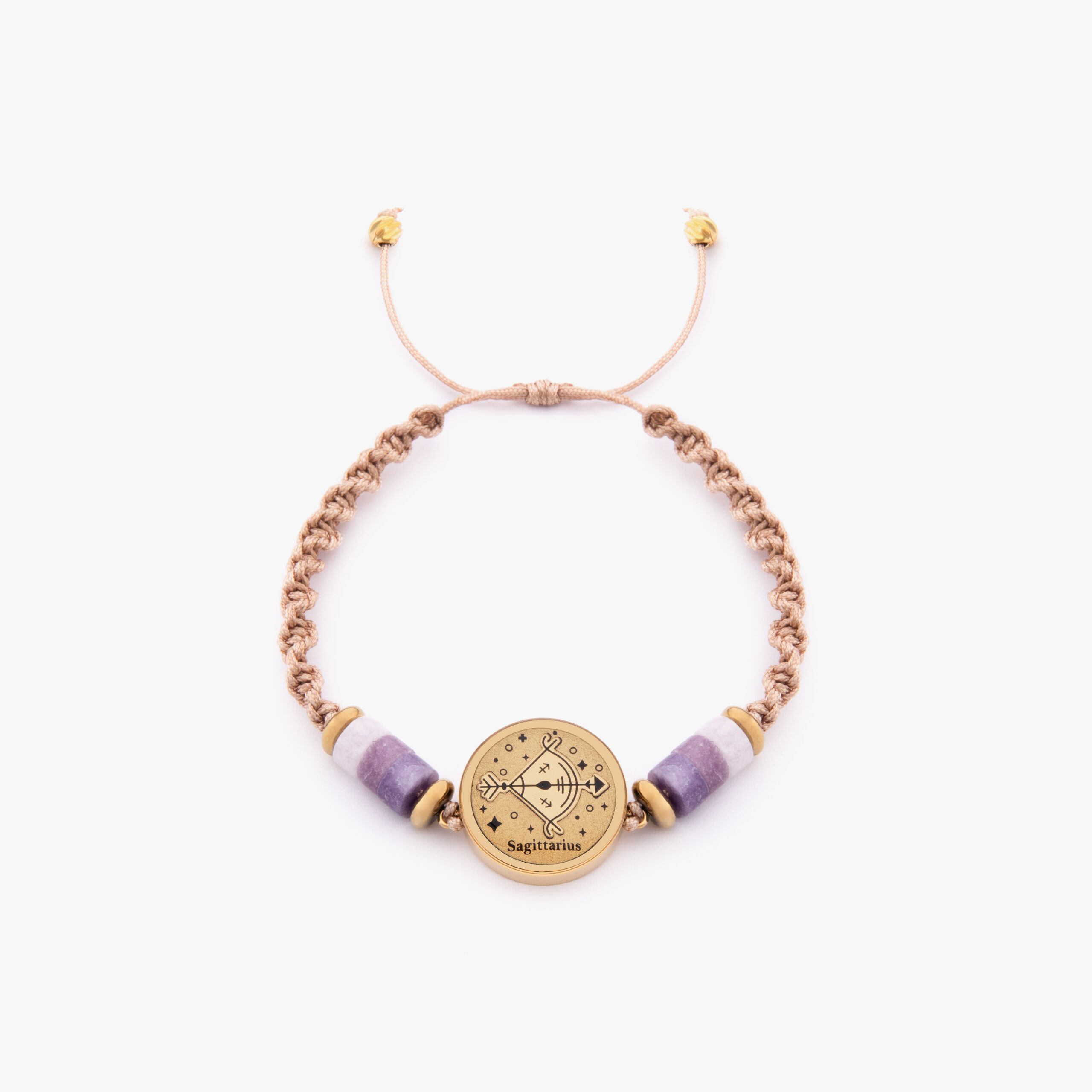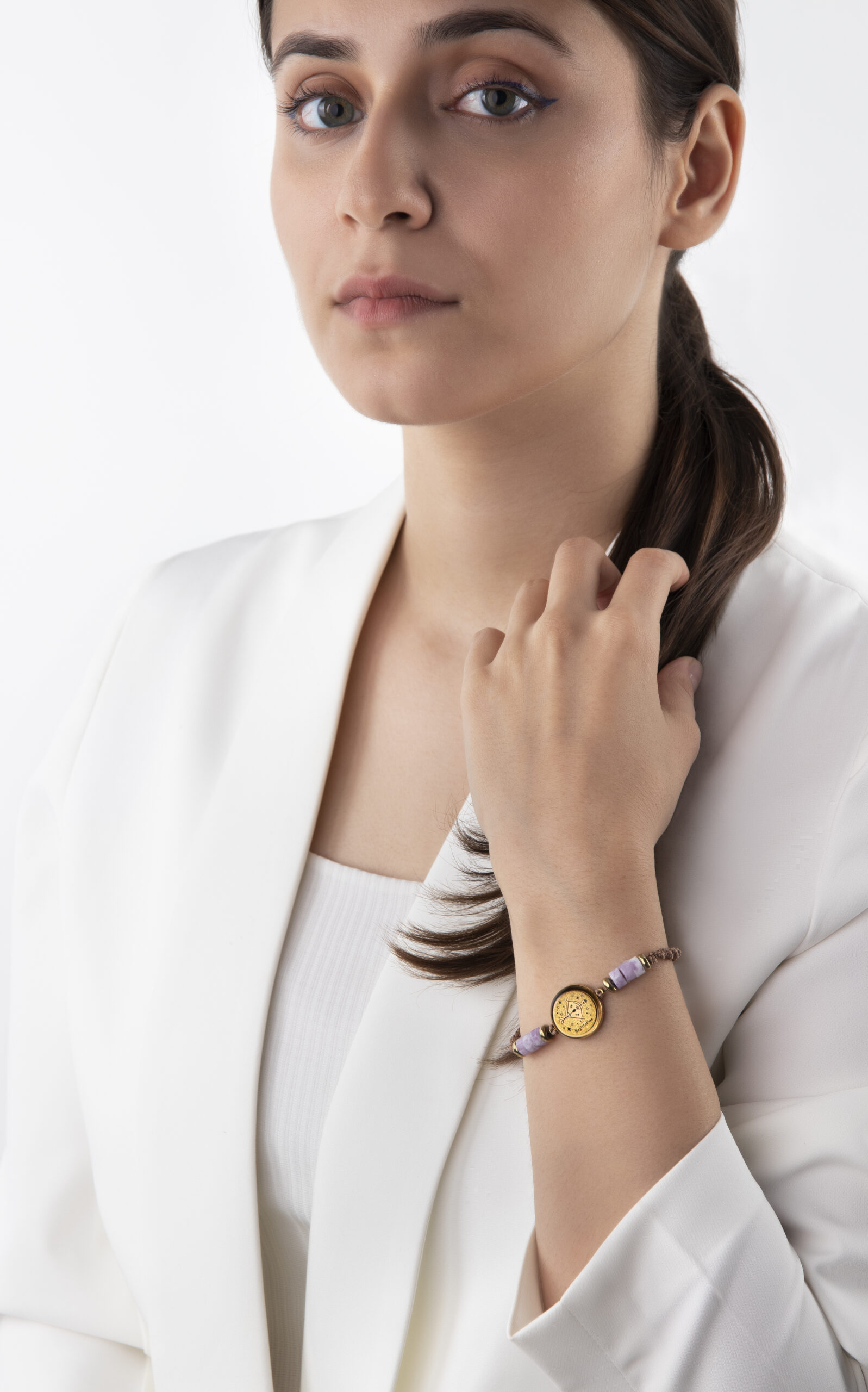 پولک این دستبند از استیل ۳۱۶ ساخته شده و با طلای ۱۸ عیار به روش PVD آبکاری شده است؛ ترکیبی که هم زیبایی و هم دوام را تضمین میکند. بند این زیور از ترکیب نخ مقاوم و سنگ طبیعی آماتیست استوانهای ساخته شده است؛ آماتیست بهعنوان سنگی نمادین برای آرامش، تمرکز و تعادل روانی شناخته میشود و رنگ بنفش آن جلوهای خاص و زنانه به دستبند میبخشد.