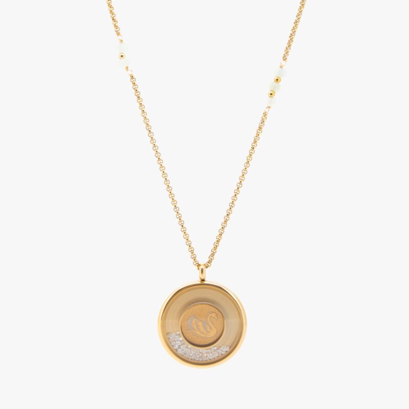 این محصول یک گردنبند زنانه با طول بند حدود ۷۰ سانتیمتر است که بهکمک قفل فلزی بسته میشود و برای استفاده بهصورت بلند و آزاد روی لباس طراحی شده است. جنس بند از استیل ۳۱۶ انتخاب شده؛ آلیاژی بادوام و ضد حساسیت که برای استفاده طولانیمدت مناسب بوده و در کنار آبکاری طلا، ظاهر شکیل و هماهنگی با پولک ایجاد میکند. پولک گردنبند از جنس استیل ۳۱۶ ساخته شده و با تکنولوژی PVD طلا آبکاری شده تا رنگ طلایی آن در طول زمان ثابت و ماندگار باقی بماند. شکل پولک گرد است و سایز آن حدود ۳ سانتیمتر در نظر گرفته شده؛ ابعادی که باعث میشود طرح قو کاملاً خوانا و شاخص روی گردن دیده شود.