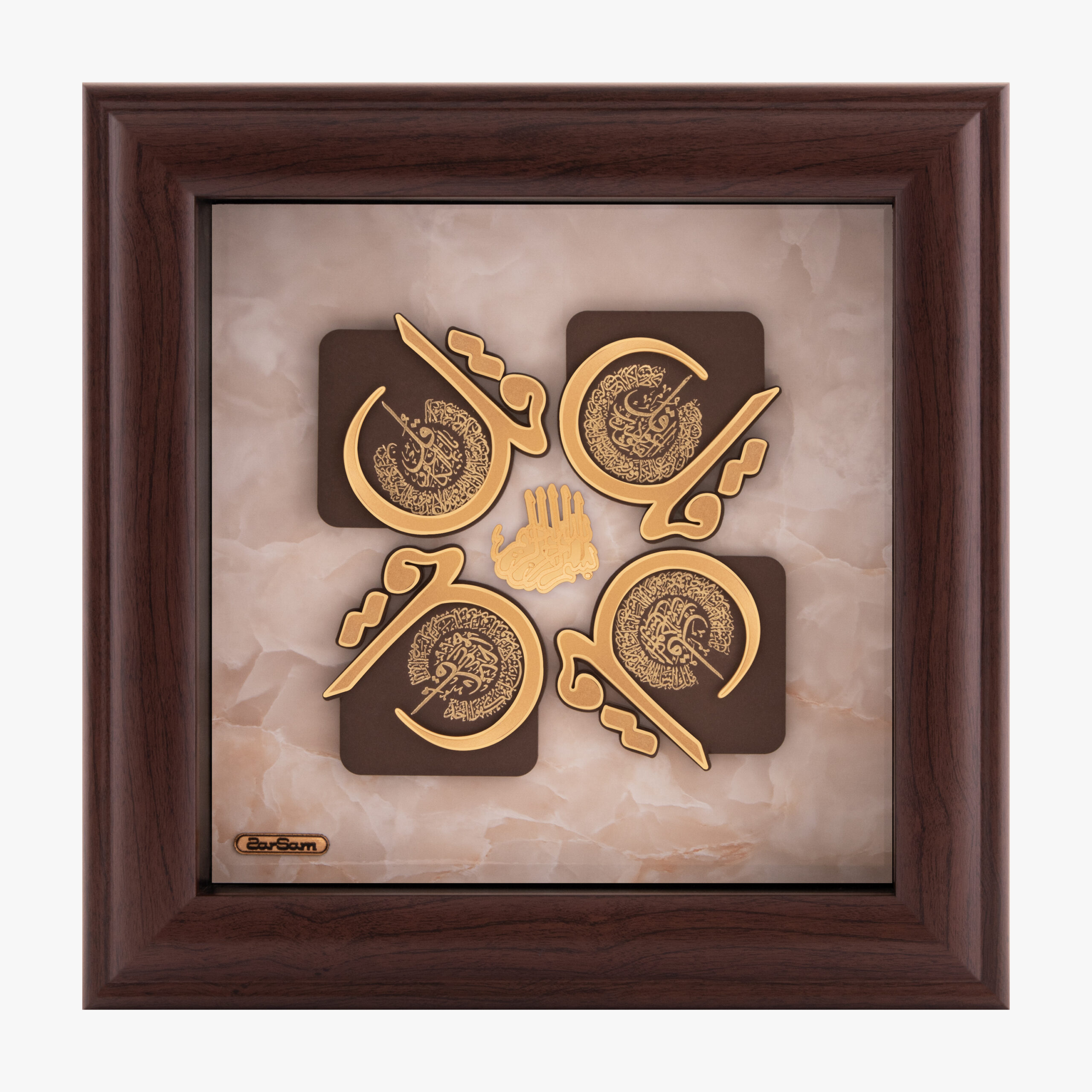 در مرکز تابلو، متن چهار سورهی شریفه با ورق طلای 24 عیار اجرا شده و با لایهای محافظ از رزین شفاف پوشانده شده تا در برابر گردوغبار و رطوبت مقاوم باشد.